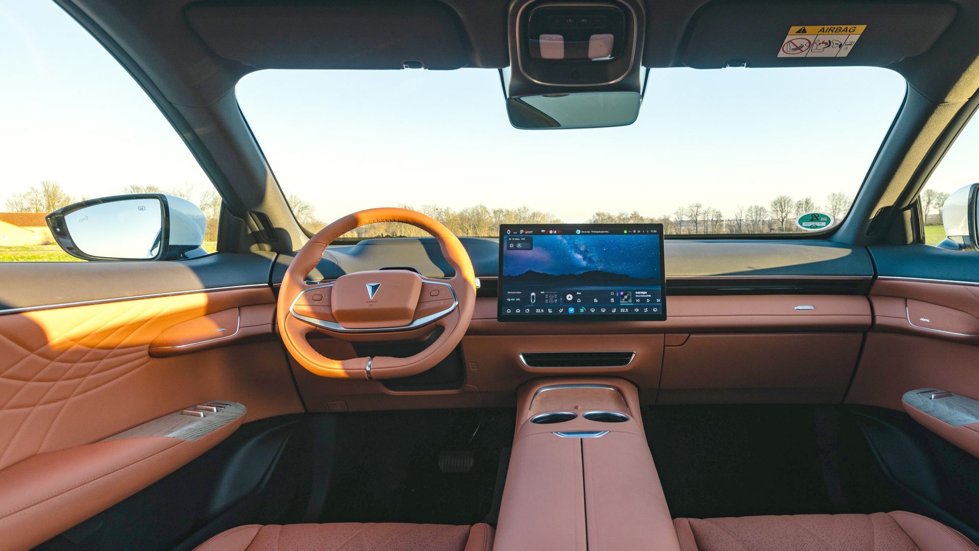Leise surrend geht’s los. Der 160 kW/217 PS starke Elektromotor im Heck kommt spielend leicht mit dem Changan Deepal S07 zurecht. Das Fahrwerk zeigt einen ausgewogen abgestimmten Kompromiss zwischen Straffheit und Komfort. Schnell hat man sich auch an die fehlenden Instrumente vor dem Steuer gewöhnt. Infos wie Geschwindigkeit und Navi kommen vom gestochen scharfen Head-up-Display in der Windschutzscheibe. Seltsamerweise ist die Verkehrszeichenerkennung jedoch nur auf dem Monitor einsehbar. Assistenzsysteme gibt’s natürlich in Hülle und Fülle. Positiv fiel uns der vernünftig agierende Spurhalter auf, der nicht ruppig, sondern sanft eingriff.