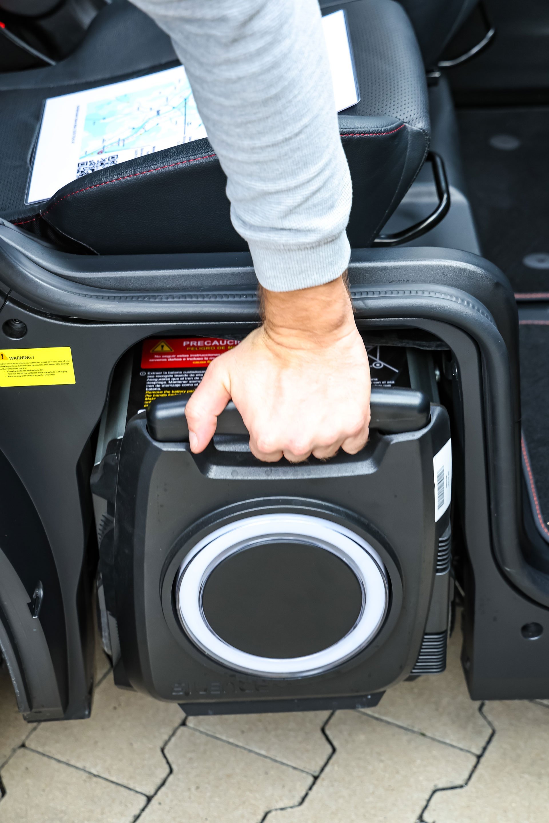 Die Grundidee fürs Stromtanken ist, die Energie immer aus der Haushaltssteckdose zu holen. Entweder dockt man mittels beiliegendem Ladekabel den Silence S04 direkt an den Stromanschluss an, oder man nimmt die mit einem Rollensystem verbundenen Akkus einzeln aus ihrer Schale unterm Sitz und zieht sie wie einen Rollkoffer zur gewünschten Ladebuchse. Das Gewicht von 41 Kilogramm pro Batterie ist jedoch nicht zu unterschätzen. Dieses einfach mal kurz eine Treppe hochzuwuchten, verlangt ordentlich Kraftaufwand. Eine volle Ladung von Null auf 100 Prozent dauert zwischen sieben und neun Stunden.