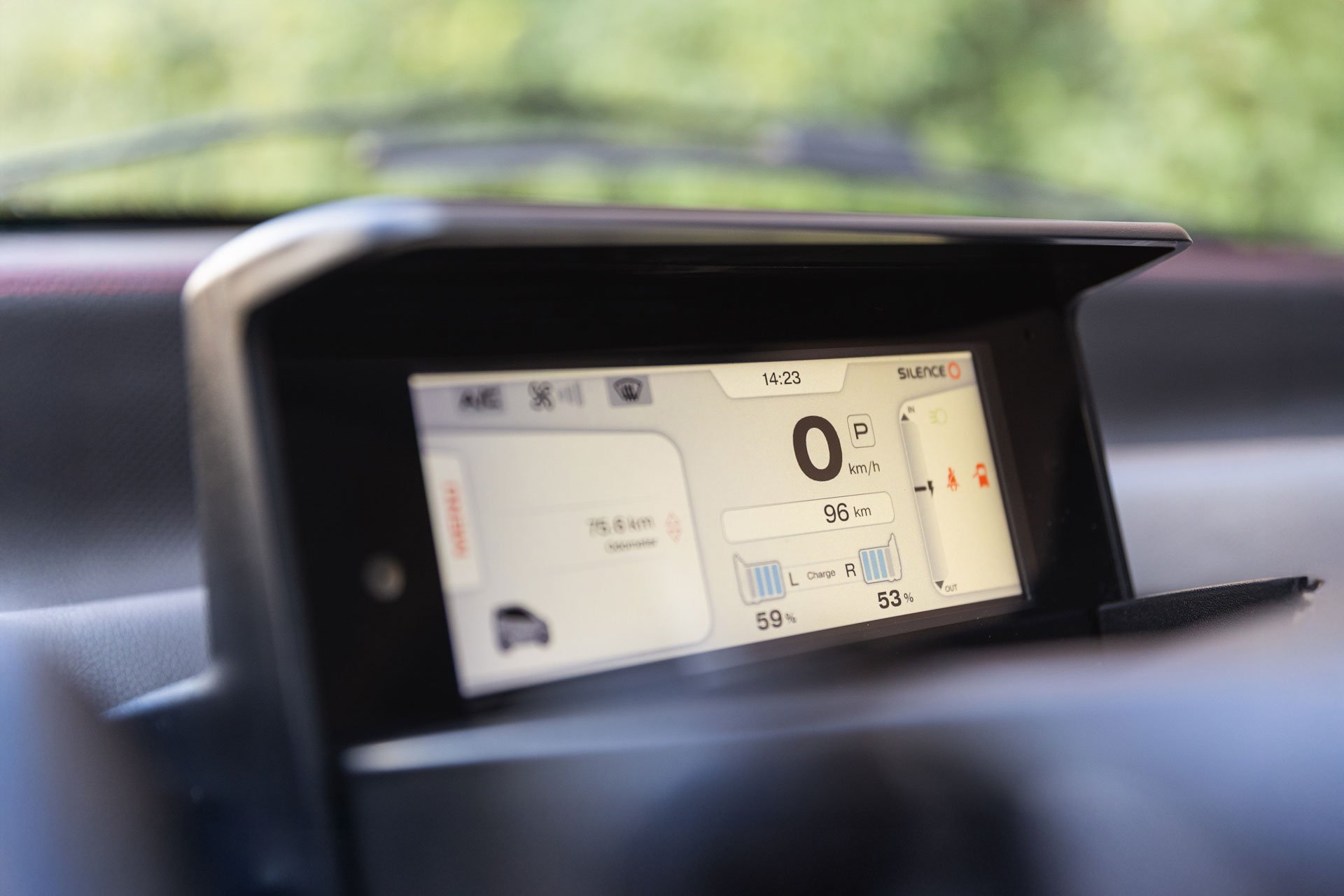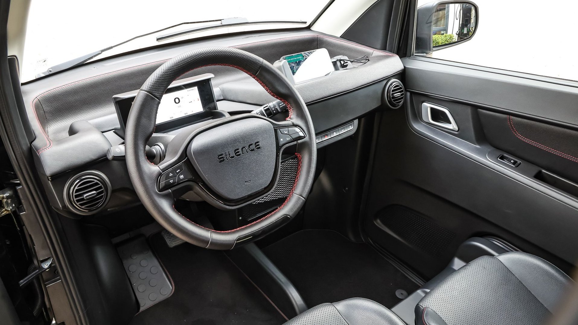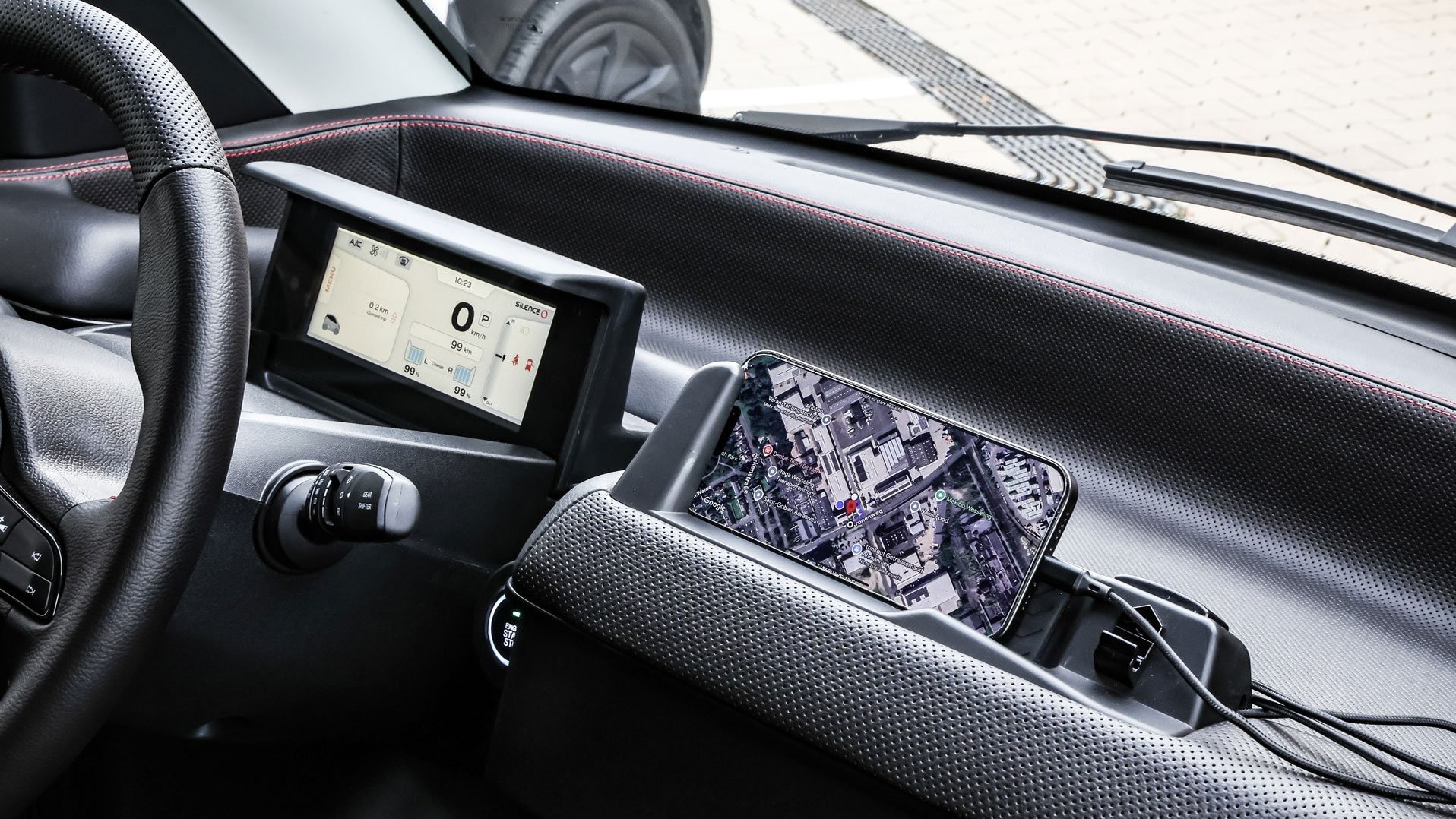 Zur Konnektivität wird das eigene Smartphone mittels vorhandenem Kabel eingestöpselt, sodass Musik und Navi ordentlich in Betrieb genommen werden können. Vor dem vollwertig-handlichen Lenkrad, das ebenso erstaunlich luxuriös wirkt wie die elektrischen Fensterheber und Außenspiegelversteller, sitzt die digitale Kommandozentrale des Silence S04. Hier können auch alle Bordinfos zu Ladestand, Reichweite sowie zu Fahrprogrammen abgerufen werden.