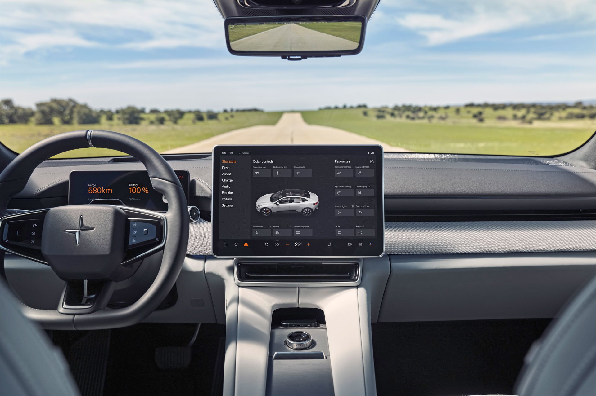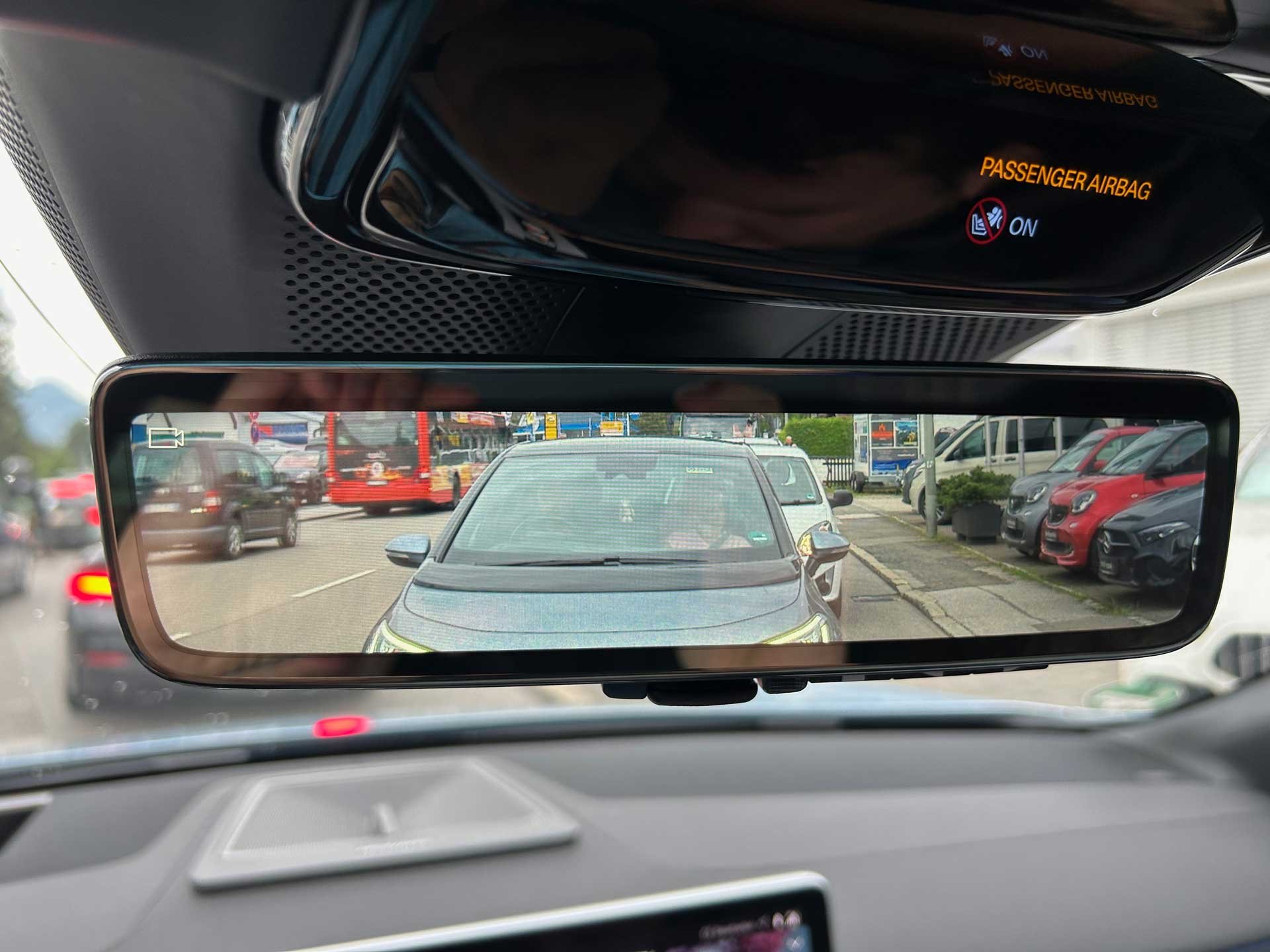 Damit der Fahrer ungehindert auf den rückwärtigen Verkehr blicken kann, gibt es im Polestar 4 statt eines herkömmlichen Innenspiegels einen umschaltbaren 8,9 Zoll großen Bildschirm-Spiegel. Eine Kamera auf dem Autodach erfasst einen Großteil des hinteren Umfelds. Im Gegensatz zu einem klassischen Spiegel aber sehen wir vom Hintermann nur ein zweidimensionales Bild; Geschwindigkeit und Entfernung lassen sich schwerer abschätzen.