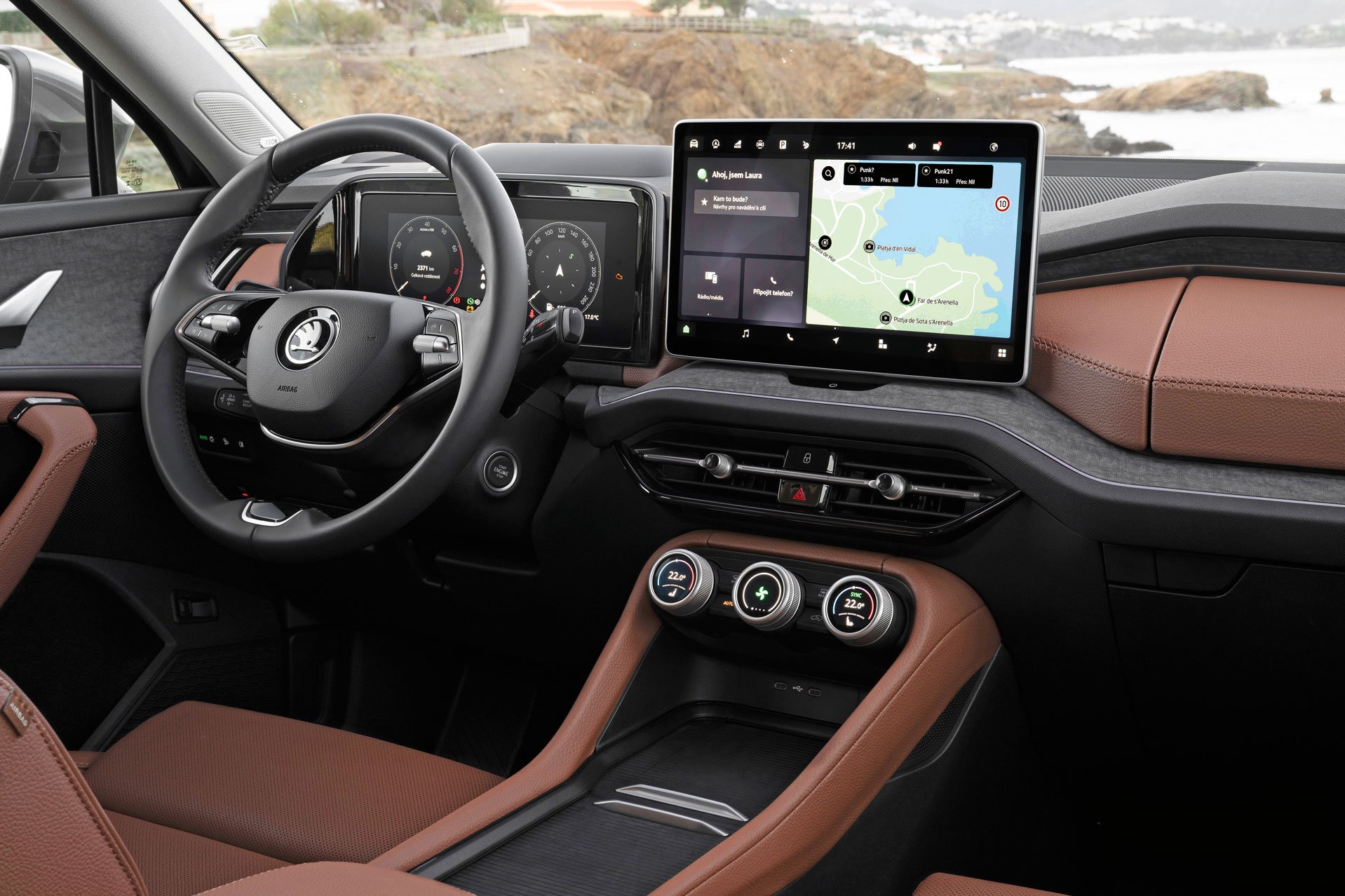 Im Cockpit geht Skoda den sinnvoll-digitalen Weg, neben einem mit 13 Zoll richtig großen Bildschirm noch ein paar Dreh-Drück-Schalter bereitzuhalten. Das ist klug, zumal diese drei unter den Lüftungsdüsen sitzenden Teile mehrfach belegt sind. Man kann die Funktionen durch Druck wechseln und somit Temperatur, Sitzheizung oder Sitzkühlung aufrufen. Ansonsten bietet der Innenraum eine gewohnt sachliche Atmosphäre.
