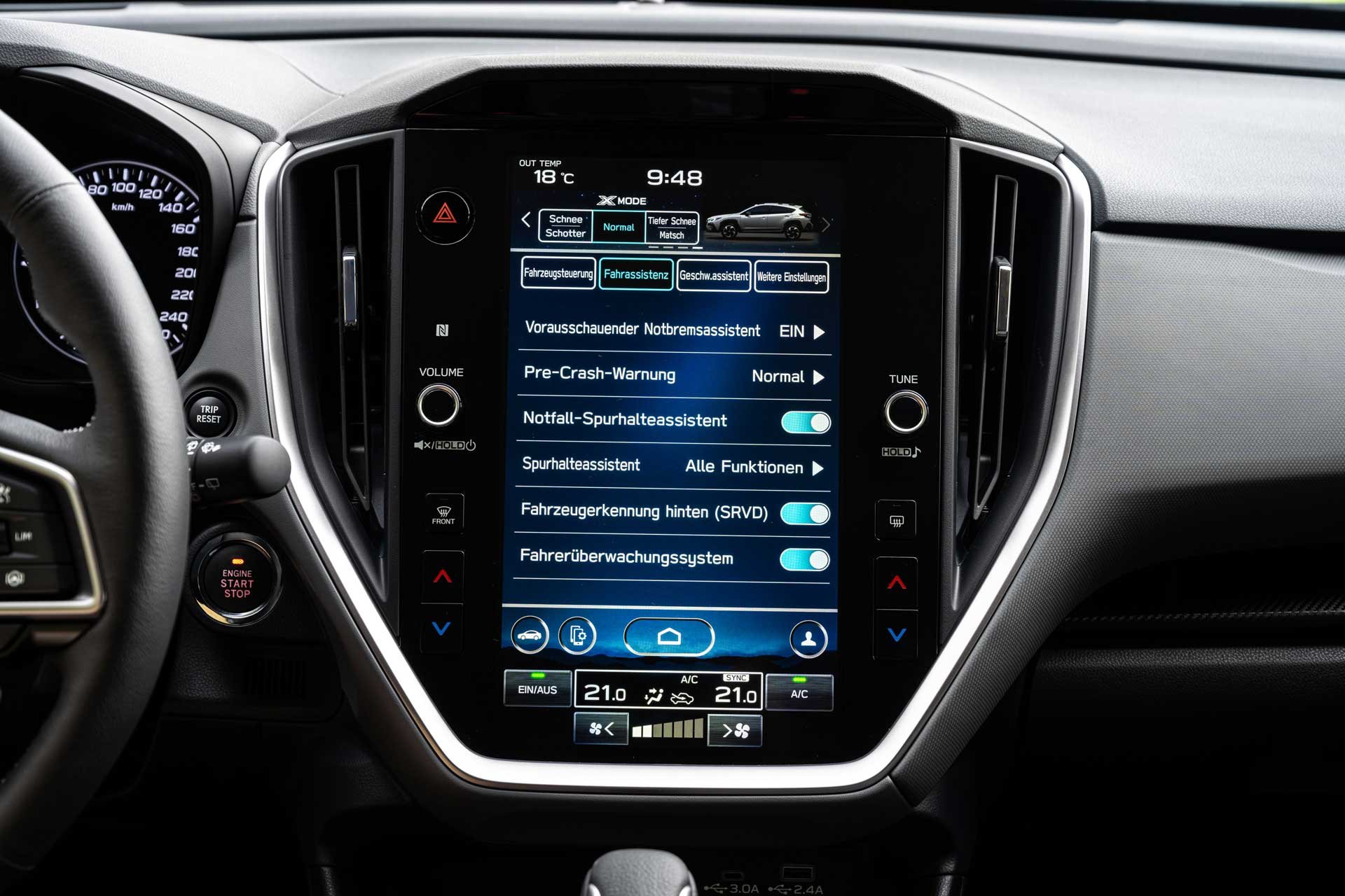 Wie bei Subaru üblich, arbeitet unter der Haube ein Boxermotor, der aus zwei Litern Hubraum eine Leistung von 100 kW/136 PS erwirtschaftet. Unterstützung erhält dieser von einem 12,3 kW/16,7 PS starken E-Motor, der bei der Beschleunigung behilflich ist und den Kraftstoffverbrauch zügeln soll. Mit einem Normverbrauch von 7,7 Litern Superbenzin auf 100 Kilometer wird der Mildhybrid trotzdem nicht zum Sparwunder, der Testverbrauch über Autobahn- und Landstraßen kletterte sogar auf über acht Liter. Die Kraftübertragung erfolgt ausschließlich über eine CVT-Automatik mit sieben elektronisch simulierten Schaltstufen. Bei normaler Fahrt unauffällig, heult der Motor bei durchgetretenem Gaspedal aber merklich auf.