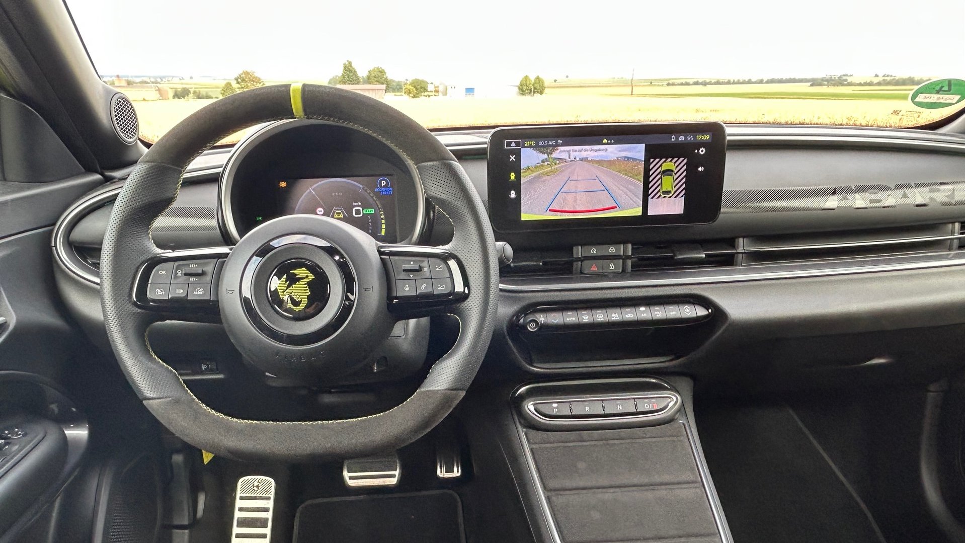 An der Schnellladesäule lädt der Abarth 600e seinen Akku von 0 auf 80 Prozent in nur 27 Minuten auf. Die maximale Ladeleistung beträgt 100 kW – ein Wert, wie er auch bei vergleichbaren Modellen von Opel, Peugeot und Citroën üblich ist. Im Test lag der Verbrauch durchschnittlich bei 19 kWh, in der Stadt und auf Überlandstrecken minimal bei 15 kWh, auf der Autobahn eher bei 24 kWh. Laut Hersteller liegt die Reichweite der getesteten 207 kW/280 PS-Version des Abarth 600e mit ihrem 54-kWh-Akku bei bis zu 344 Kilometern. In der Praxis hängt diese jedoch stark vom Fahrstil, dem gewählten Fahrmodus (Tourismo, Scorpion Street, Scorpion Track) und dem Fahrprofil ab. Gerade bei einem so sportlich ausgelegten Fahrzeug wie dem Abarth 600e zeigt sich: Reichweitenangaben sind nicht automatisch gleichbedeutend mit gefahrenen Kilometern. Im Testalltag verloren wir auf einer gemischten Strecke aus Stadt, Land und Autobahn im Schnitt 25 Prozent mehr Reichweite als wir tatsächlich an Kilometern zurückgelegt hatten.