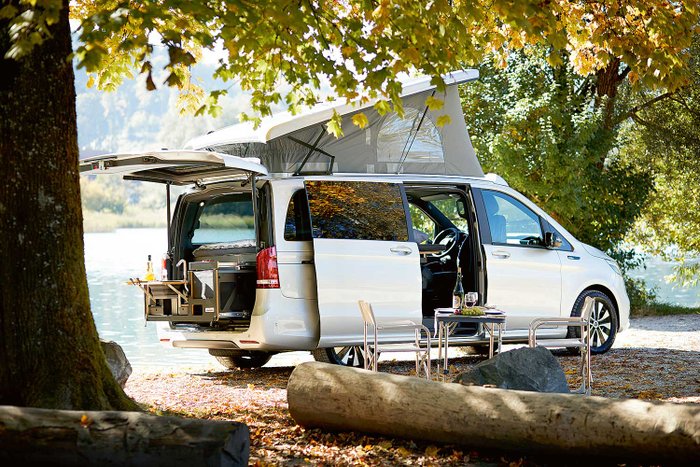 Wer denkt, dass Elektromobilität auf den Campingplätzen Europas noch nicht verbreitet ist, täuscht sich. Pedelecs, E-Scooter und Co. gehören bei vielen längst zum Campingurlaub dazu. „Was noch nicht so stark Einzug gehalten hat, ist das Thema E-Mobilität bei den Fahrzeugen, also bei den Zugfahrzeugen, Wohnmobilen und dergleichen. Dort findet man verstärkt Plug-in-Hybride, aber auch schon vereinzelt Elektroautos“, sagt Markus Emmert, Vorstandsmitglied beim Bundesverband eMobilität (BEM). Das ist nicht erstaunlich, denn das Angebot an fürs Camping geeigneten Elektrofahrzeugen ist derzeit noch überschaubar. „Im Kastenwagen-Bereich, also bei den besonders kompakten Fahrzeugen, tut sich bereits etwas, ist aber für uns noch nicht zu beziffern“, sagt Jonathan Kuhn, Pressesprecher beim Caravaning Industrie Verband (CIVD). Einer der ersten marktreifen E-Campervans ist der von der Schweizer Firma Sortimo Walter Rüegg AG umgebaute batterieelektrische EQV von Mercedes Benz. Der Campervan mit 60- oder 90-kWh-Batterie (WLTP-Reichweite: bis zu 363 Kilometer) wird im Zweirechnungsgeschäft vertrieben.