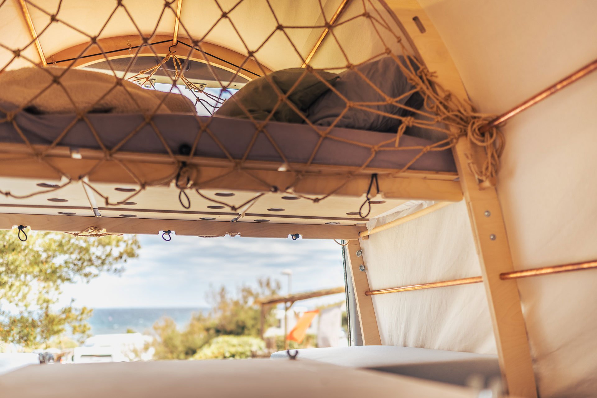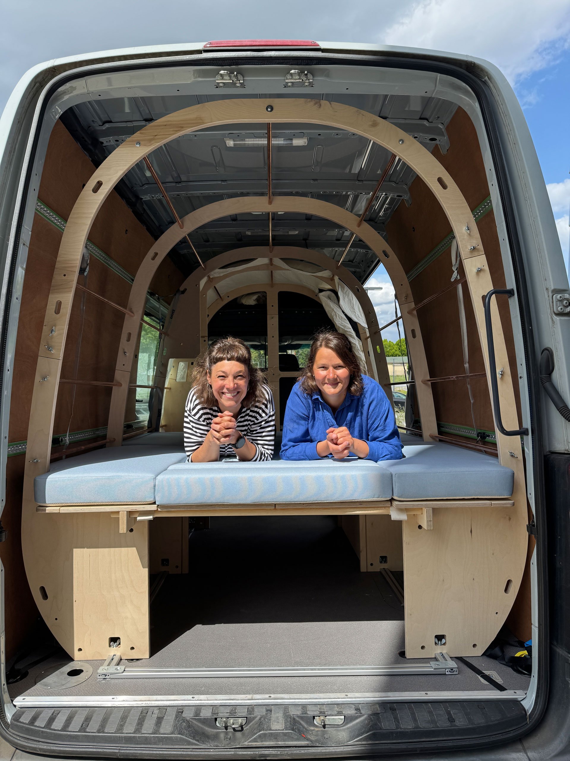 Im vorderen Bereich werden Regalböden für die Küche und den Kleiderschrank eingelegt. Hinten entsteht das Bett aus Zwischenböden, unter denen man auch Gepäck verstauen kann. Ladungssicherung haben Vera und Frauke an jedem Punkt mitgedacht. Die Gepäckschotten lassen sich schließen und mit kleinen Spanngummis festzurren. Auch die Rippen sind mit Spanngurten an den Verzurrösen des Transporters gesichert. Ein Roll-Lattenrost, der später als Wäscheständer genutzt werden kann, kommt unter die Bettplatten. Polster drauf, fertig ist die 1,90 mal 1,60 Meter große Liegefläche. Tagsüber kann diese in ein Daybed, also eine Couch in U-Form mit Aussicht zur Hecktür hinaus verwandelt werden. Aus den Bettplatten entsteht ein kleiner Tisch. Fehlt nur noch die Hülle aus Baumwolle, die über die fünf Walrippen gespannt wird. Auch hier: jeder Punkt durchdacht. Ein Gummi zieht sich direkt in eine Nut am Holz und spannt die Hülle wie ein Kokon über den Bauch des Wals. Das Campingabenteuer kann beginnen.