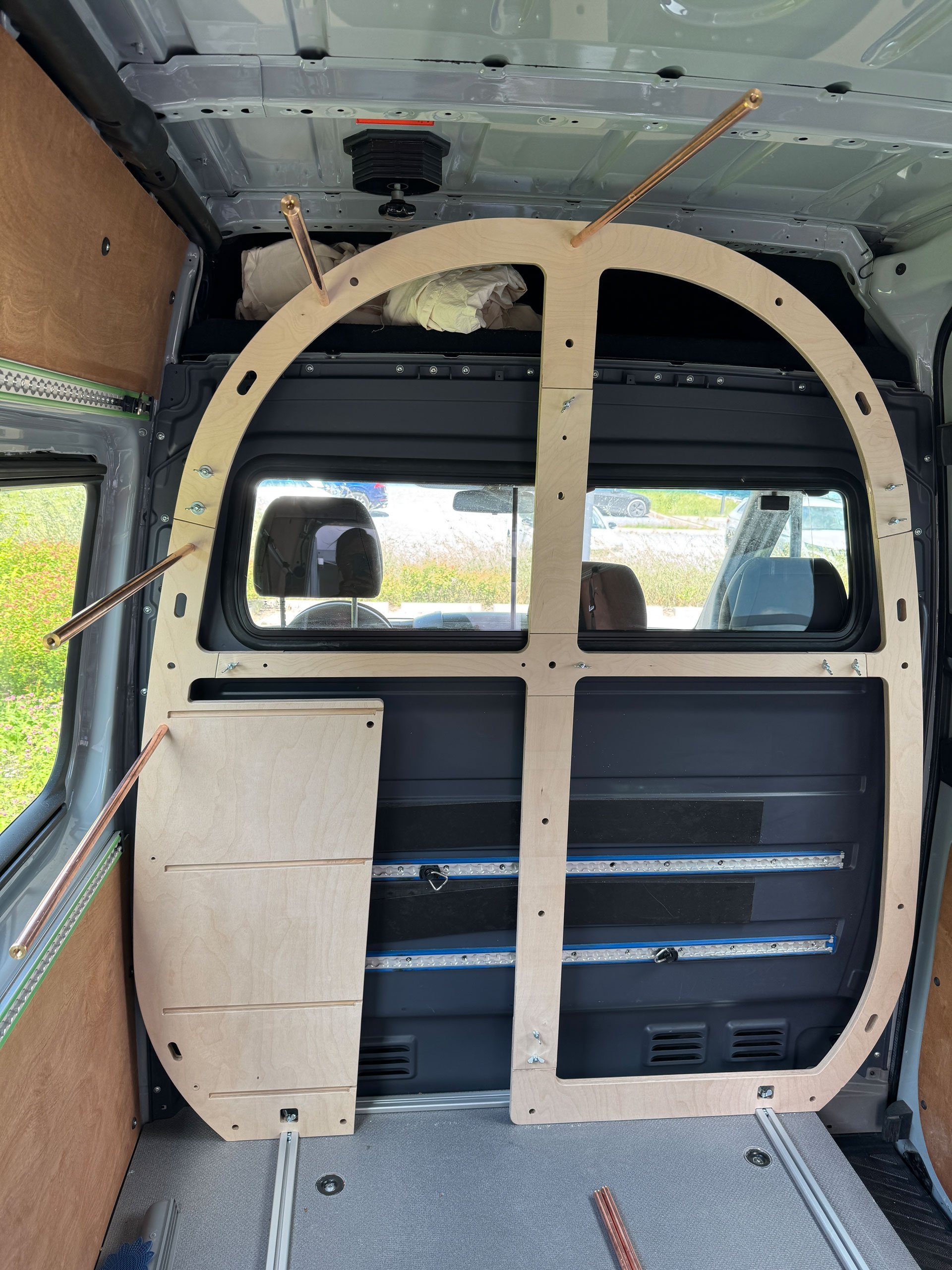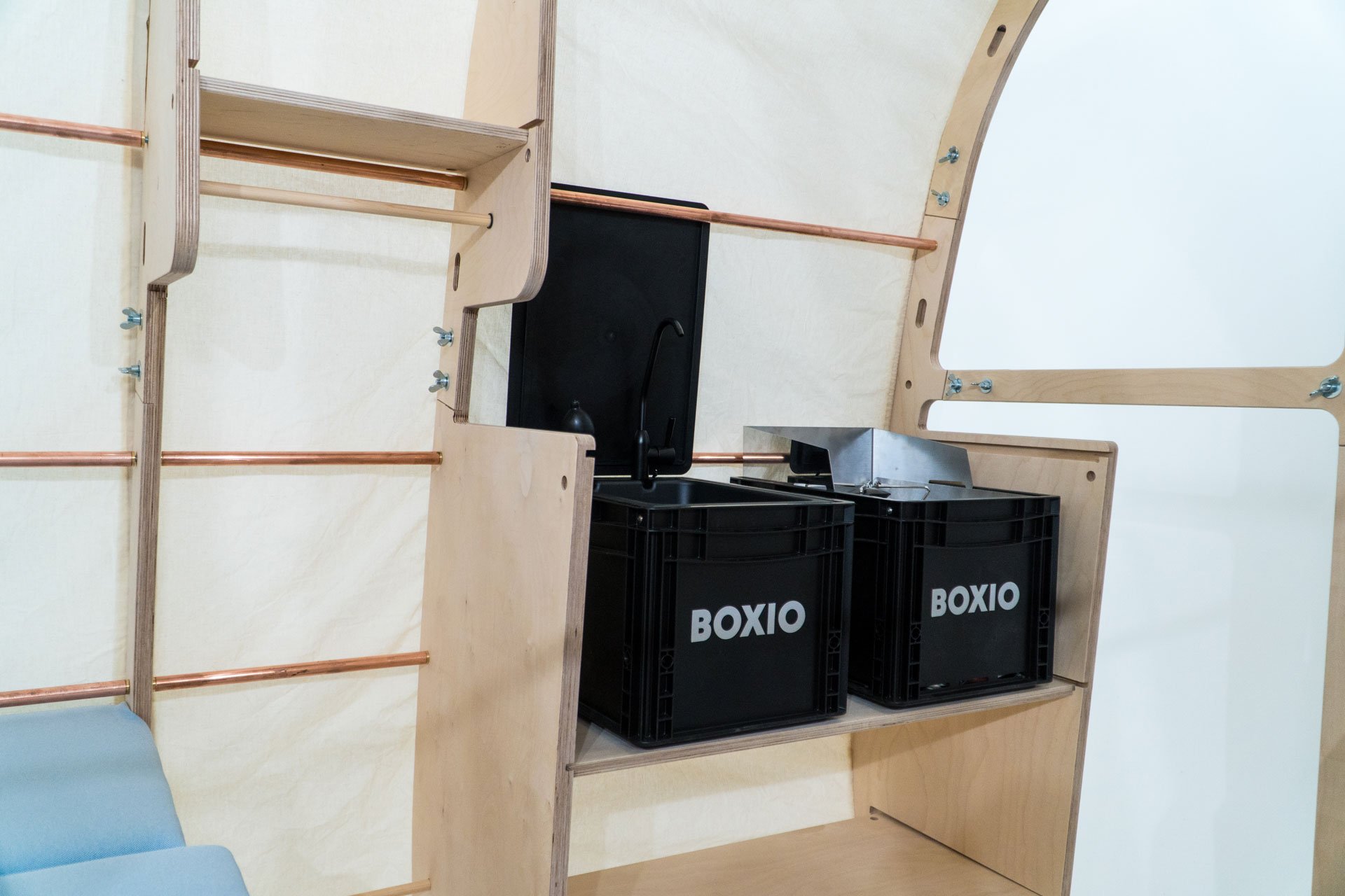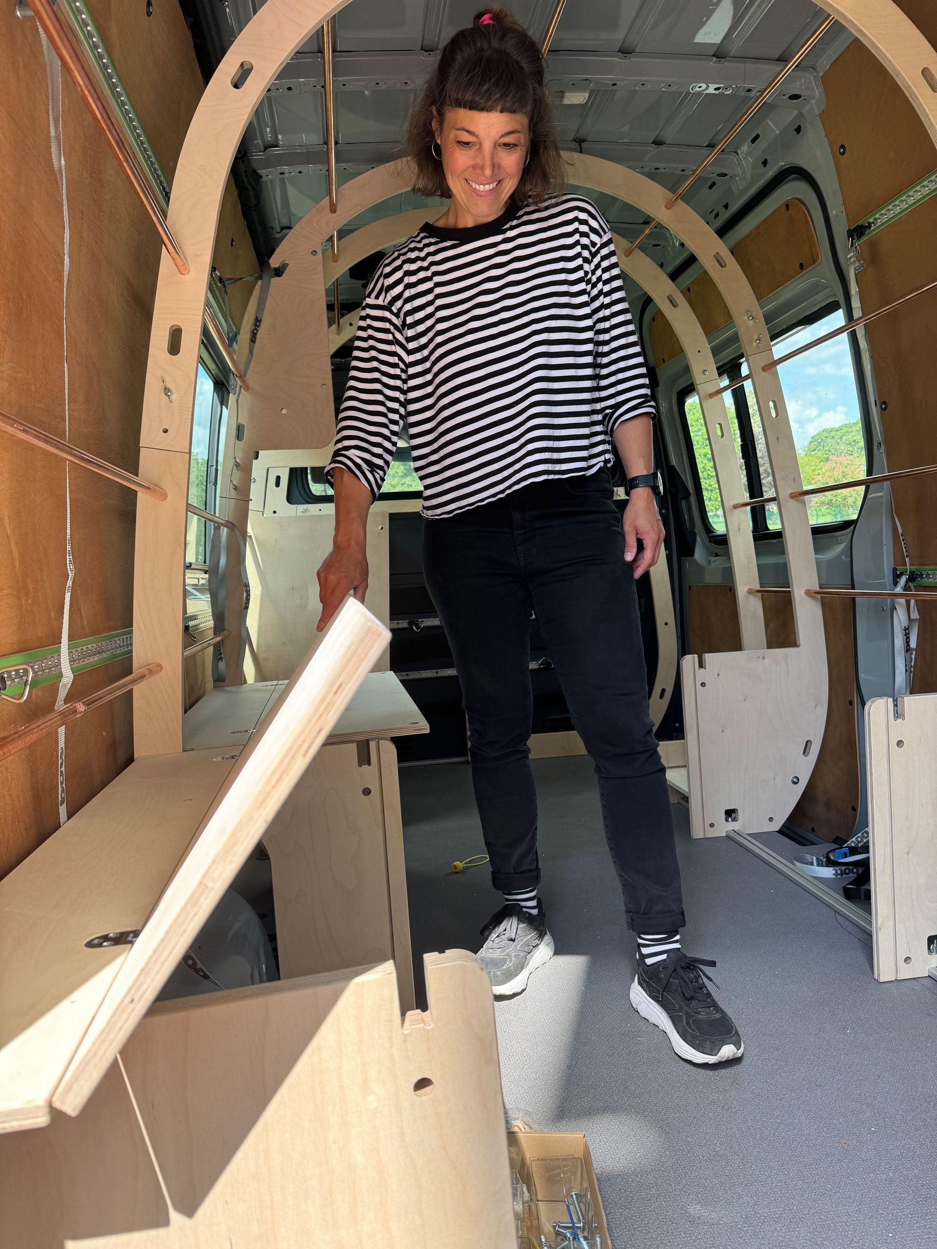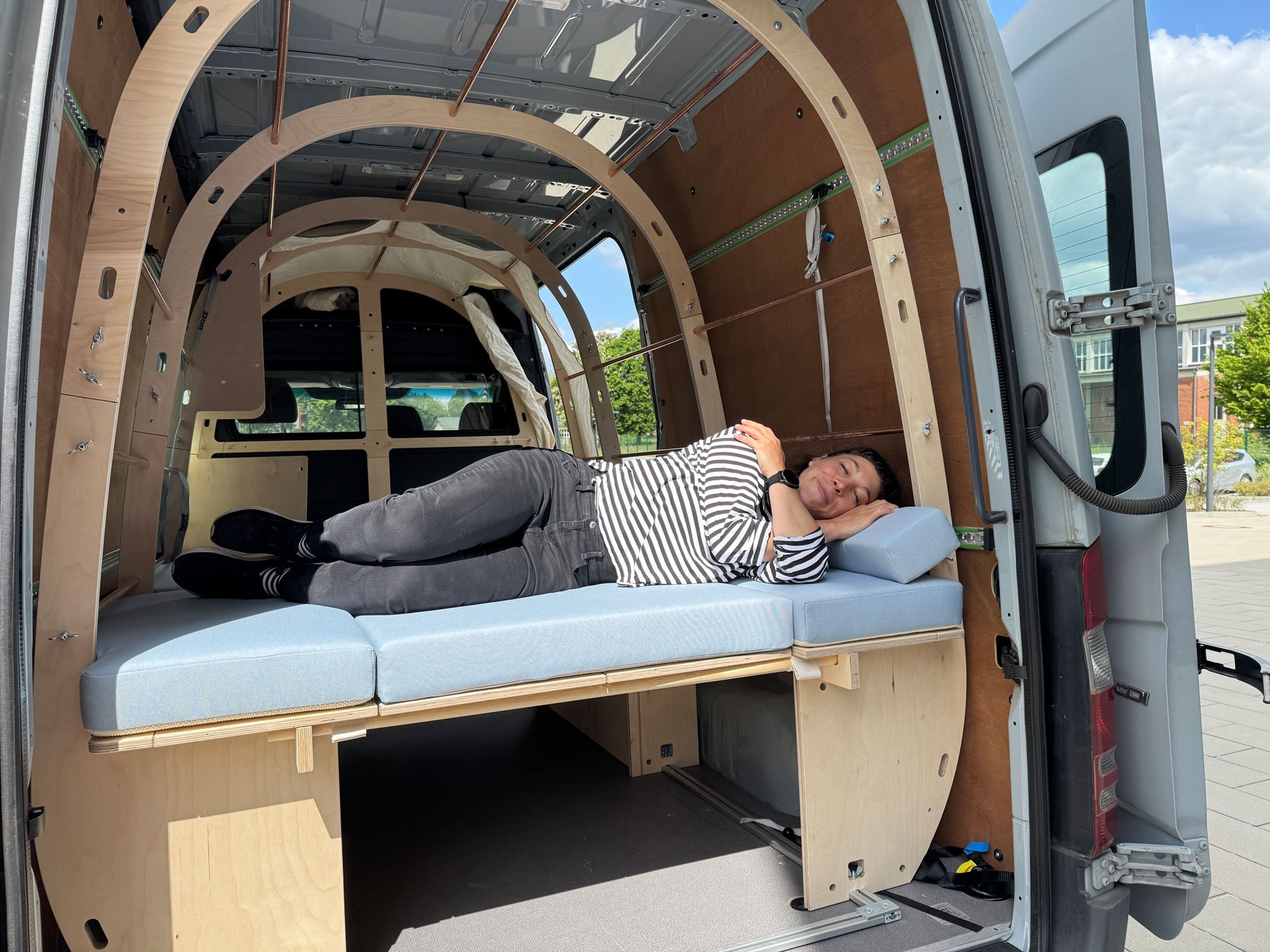 Und wie funktioniert das Ganze nun? Man nehme einen x-beliebigen Transporter wie einen Mercedes Sprinter oder den VW Crafter. Geliehen vom Arbeitgeber, gemietet oder von Freunden. Die Bauteile befinden sich gut sortiert in einer 150 mal 40 Zentimeter schmalen Rollbox. Zuerst werden die Fixierschienen aus Alu auf dem Laderaumboden ausgelegt und miteinander verbunden. Was wohin gehört, ergibt sich aus der Beschriftung. Auf diesen Basisschienen wird der Walbauch aufgebaut, Rippe für Rippe. Lediglich mit Schrauben, Muttern und Flügelmuttern. Zwischen den Rippenbögen aus Multiplex-Holz sorgen Alu- oder Kupferrohre (je nach Wunsch) für die nötige Stabilität. In das Rohrsystem können Camper später Zubehör oder das zusätzlich erhältliche Kinderbett als zweite Ebene einhängen.