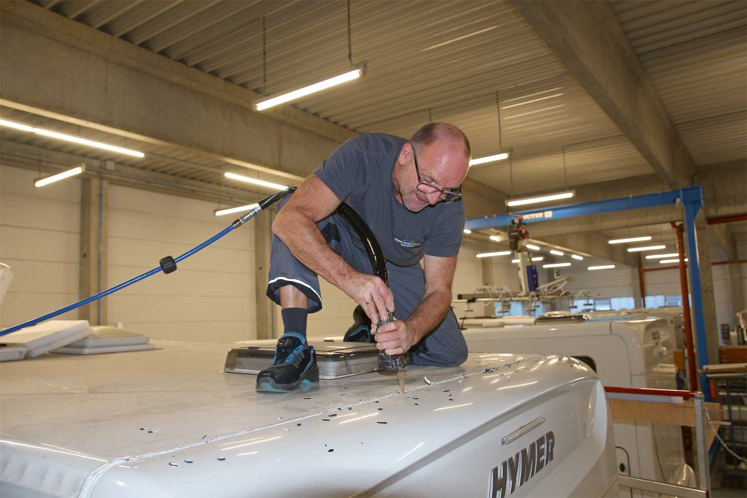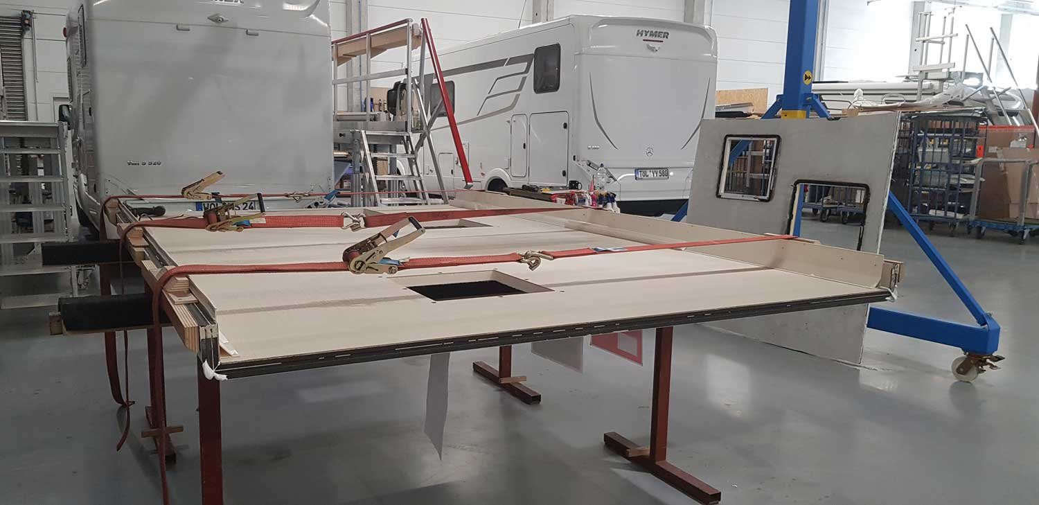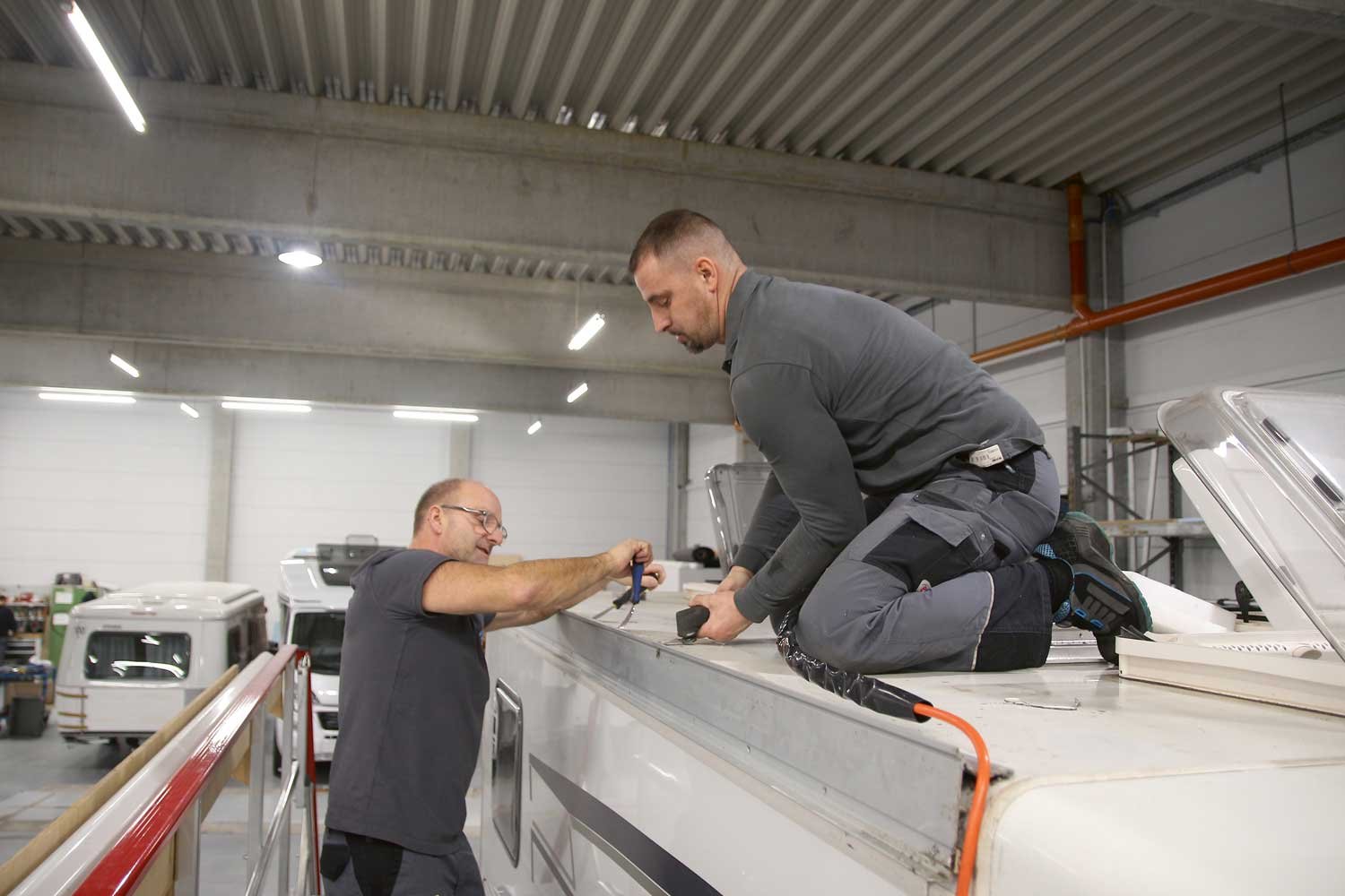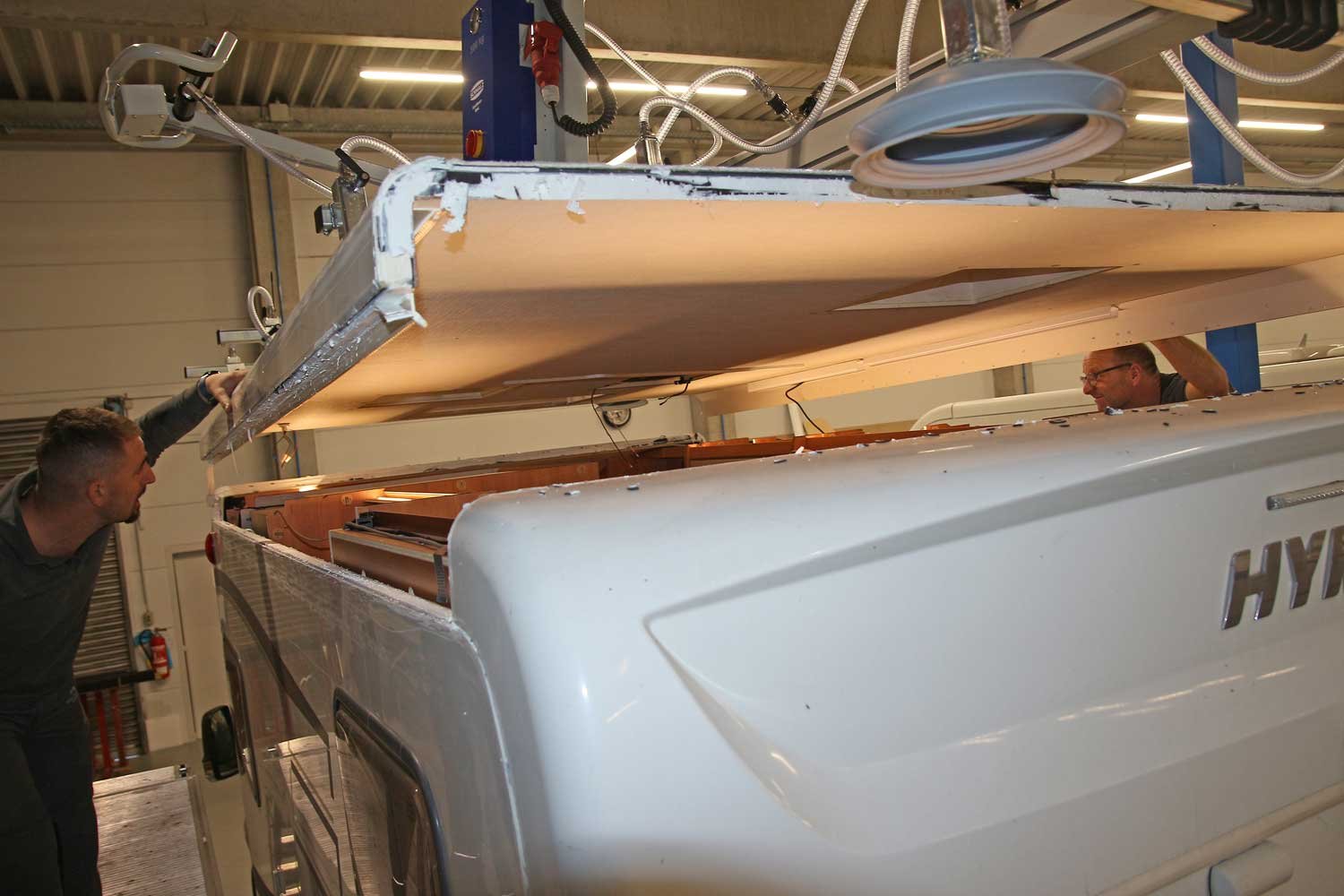 Im Erwin Hymer Center in Bad Waldsee am Standort des gleichnamigen Wohnmobilherstellers werden jeden Monat ein bis zwei Hageldächer ausgetauscht. Die Werkstatt ist für die nächsten Monate bereits ausgebucht, die Kunden kommen aus ganz Deutschland und dem benachbarten Ausland. Wie wichtig es ist, dass jeder Handgriff sitzt, wird schnell deutlich, wenn man Thomas Huber und Sabit Lutoli bei den Vorbereitungen für einen Dachaustausch beobachtet. Befände man sich nicht in einer riesigen, hell beleuchteten Werkstatthalle mit mehreren Wohnmobilen, sondern auf einem dunklen Parkplatz, könnte man meinen, Verbrecher wären am Werk – konzentriert dabei, das Campingfahrzeug in seine Einzelteile zu zerlegen.