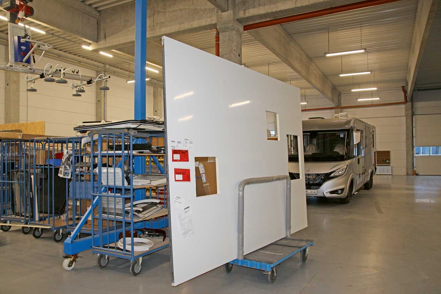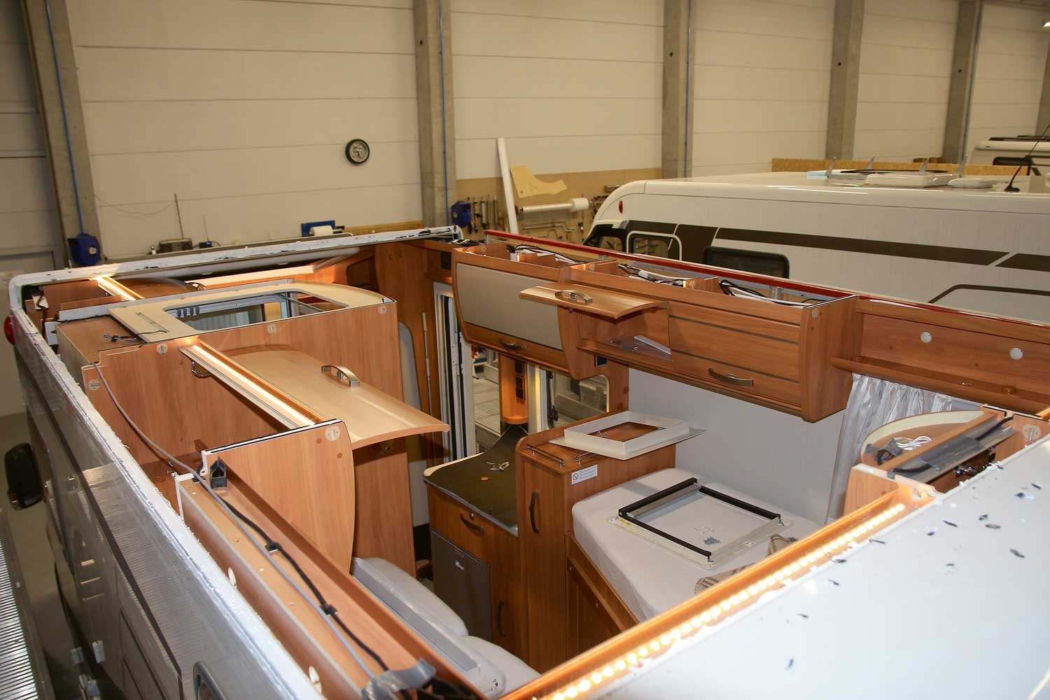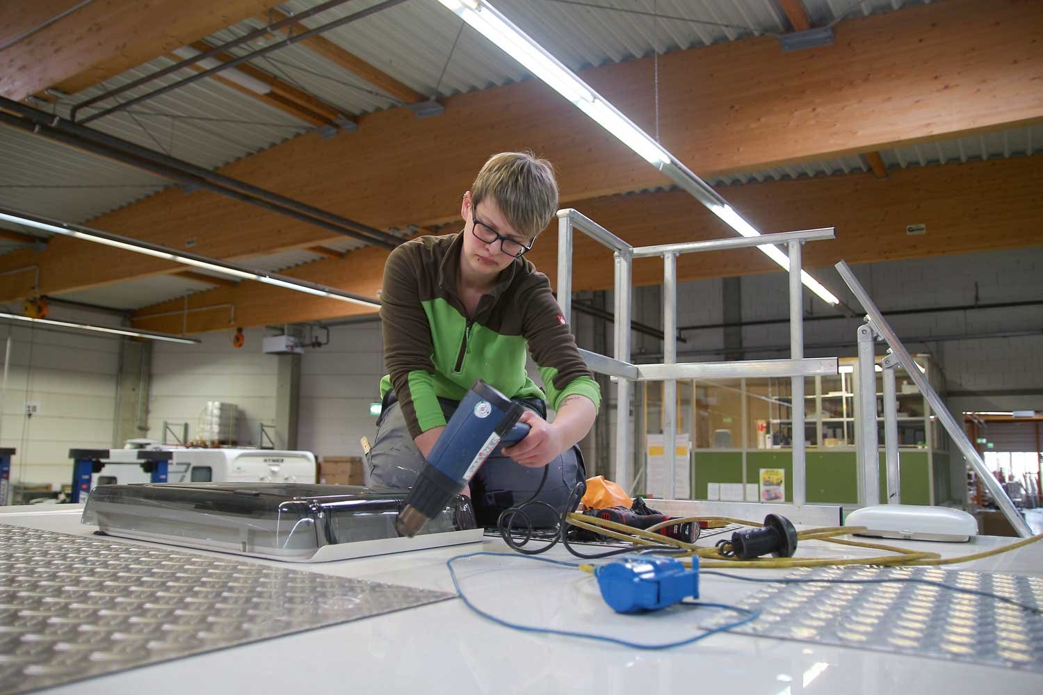 Im Erwin Hymer Center in Bad Waldsee am Standort des gleichnamigen Wohnmobilherstellers werden jeden Monat ein bis zwei Hageldächer ausgetauscht. Die Werkstatt ist für die nächsten Monate bereits ausgebucht, die Kunden kommen aus ganz Deutschland und dem benachbarten Ausland. Wie wichtig es ist, dass jeder Handgriff sitzt, wird schnell deutlich, wenn man Thomas Huber und Sabit Lutoli bei den Vorbereitungen für einen Dachaustausch beobachtet. Befände man sich nicht in einer riesigen, hell beleuchteten Werkstatthalle mit mehreren Wohnmobilen, sondern auf einem dunklen Parkplatz, könnte man meinen, Verbrecher wären am Werk – konzentriert dabei, das Campingfahrzeug in seine Einzelteile zu zerlegen.