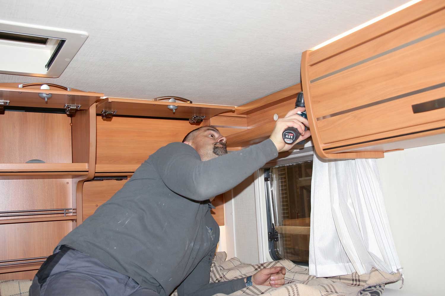 Genau das ist zum Teil nämlich zunächst einmal während der insgesamt 55 Arbeitsstunden nötig. Huber und Lutoli lösen die Markise, die später wieder verbaut wird, ziehen die Fugenabdeckprofile ab und schneiden die Dichtmasse mit einer oszilierenden Säge heraus. „Hymer ist sehr reparaturfreundlich. Da kann man Dach und Wände problemlos tauschen“, erzählt Huber. Dennoch: Jedes Fahrzeug ist anders. Das wird klar, als Lutoli Schraube für Schraube unter den Abdeckungen in den Schränken im Innenraum des Wohnmobils sucht und löst. „Wenn du eine Schraube vergisst, reißt sie dir alles raus“, erzählt er. Mit einem Eisen heben die beiden im Innenraum vorsichtig das Dach an. Um es endgültig abzunehmen, greift Huber noch einmal zur oszilierenden Säge.
