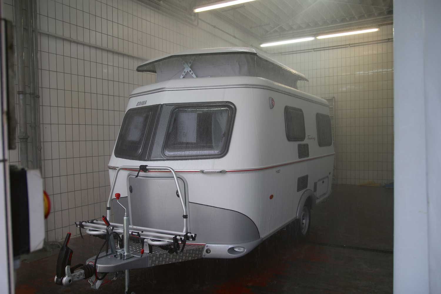 Dann kommt der große Moment: Mit tellergroßen Saugnäpfen eines mobilen Krans saugen die beiden das Dach an und heben es ab. „Jetzt machen wir ein Cabrio draus“, sagt Lutoli und grinst. Im nächsten Schritt bauen die beiden die noch intakten Dachhauben und Winkel ins neue Dach um und bringen es mithilfe von Spanngurten in die gewünschte Krümmung. Wenn alles fertig verklebt, verschraubt, abgedichtet und getrocknet ist, kommt das Fahrzeug für eine Stunde in die Beregnungsanlage. „Nach der Reparatur gibt es eigentlich nie Probleme mit der Dichtigkeit. Im Gegenteil: Ältere Wohnmobile sind in ihrem Fugenaufbau dann dichter“, berichtet Teamleiter Grimm.