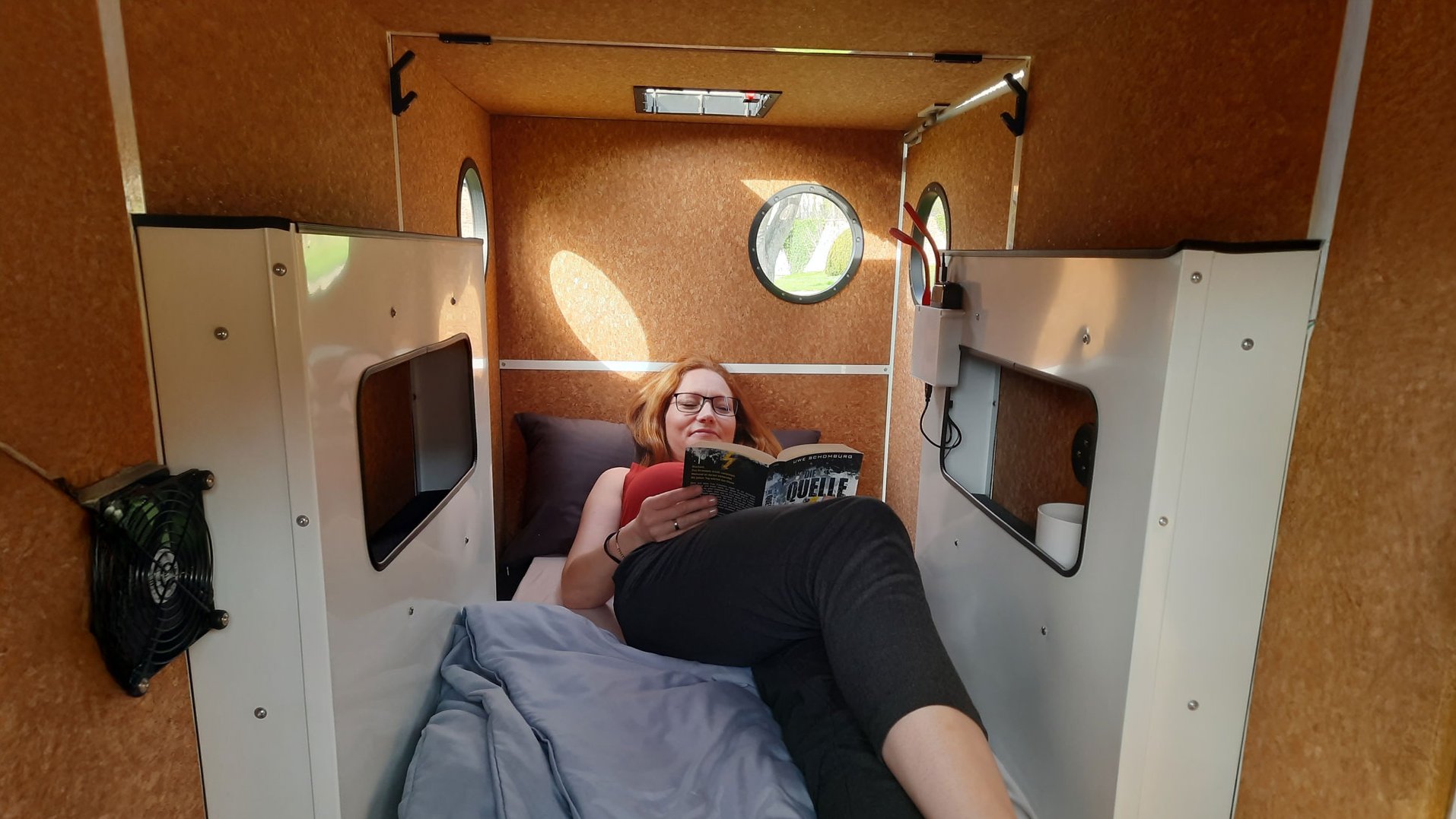In Kombination mit einem E-Bike lassen sich mit Martha auch längere Strecken mit geringem Verbrauch entspannt zurücklegen. Vor allem bei bergigen Etappen ist die Motorunterstützung hilfreich zur Bewältigung steiler Abschnitte. Gegenüber einem Zelt ist Martha die komfortablere Variante. Auf- und Abbau entfällt, der Komfort in der Box ist durch den stabilen, isolierten Aufbau hoch. Die Isolierung dämpft Geräusche und sorgt für angenehmere Innentemperaturen. Allein durch die Körperwärme sollen bei 0 °C Außentemperatur im Innenraum bis zu 6 °C erzeugt werden. Wer sich noch nicht entscheiden kann: Der Wohnwagen kann beim Hersteller in Wernigerode kostenfrei zur Probe gefahren werden.