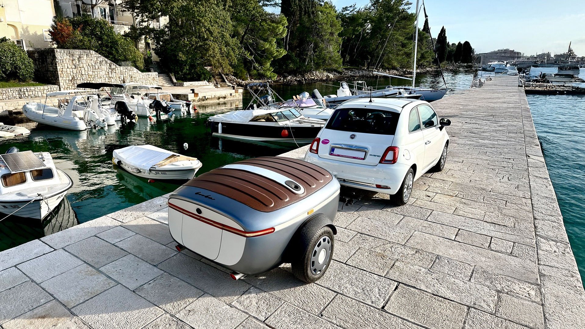 Nach der Reise lässt sich der mit abmontierter (teleskopierbarer) Deichsel nur 220 Zentimeter lange Booba hochkant in der Garage verstauen. Der Startpreis des Mikro-Campinganhängers liegt bei 10.900 Euro. Als Gegenwert gibt es die coole Optik. Die Macher sehen sie als Hommage ans Reisen mit einem Roadster. Die beiden „Auspuffrohre“ am Heck sind keine Zierde, sondern verbergen Außendusche und Landstromanschluss.