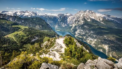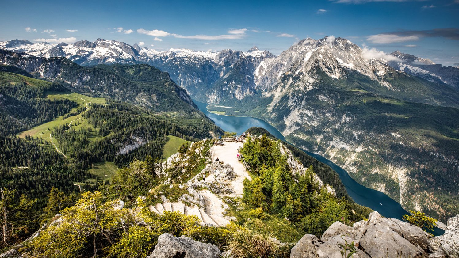 Was für ein Panorama! Wer mit der neuen barrierefreien Jennerbahn in Schönau zur Bergstation auf 1800 Metern fährt und zur Aussichtsplattform spaziert, blickt auf den langgezogenen Königssee und den legendären Watzmann. Ein Auftakt nach Maß. Deutschlands einziger alpiner Nationalpark liegt ganz im Südosten der Republik. Die Fahrt von der Seelände in Schönau über den nur per Schiff zugänglichen Königssee ist eines der Must do’s für Bayernurlauber. Doch auf den schlanken, elektrisch betriebenen Holzschiffen ohne musikalische Berieselung und Gastronomie gelingt es, die Natur in den Mittelpunkt zu stellen.