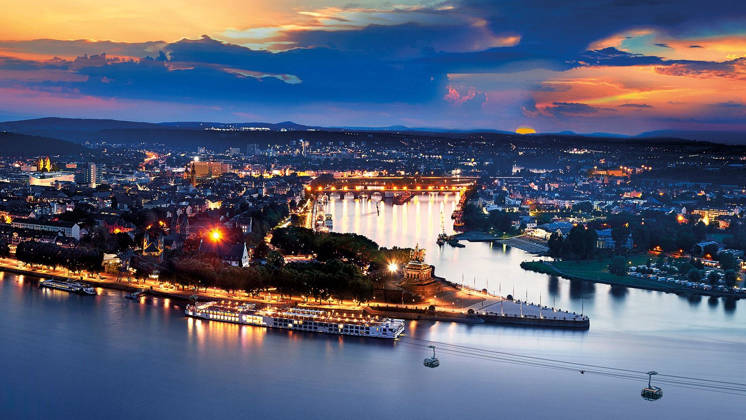 Den besten Blick auf das berühmte Deutsche Eck (Foto), wo Mosel und Rhein zusammentreffen, hat man von der Festung Ehrenbreitstein aus. Dorthin führt sogar eine Seilbahn direkt über dem Wasser. Aber auch die Altstadt von Koblenz lädt mit ihren gemütlichen Gässchen zum Bummeln ein. Und wer einen längeren Spaziergang machen will, flaniert an den Rheinanlagen bis vor zur Spitze des Deutschen Ecks, wo Kaiser Wilhelm II. über das Geschehen wacht. Ein Ausflugsziel ist auch das Schloss Stolzenfels.