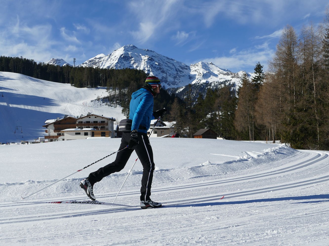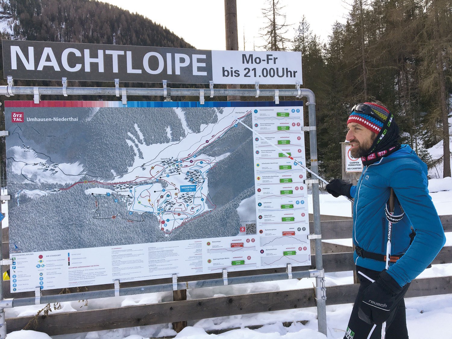 Die Sonnenplateau-Loipe ist das Herzstück des Ötztaler Langlaufzentrums in Niederthai, das mit dem Tiroler Loipen-Gütesiegel ausgezeichnet wurde. Die drei Kilometer lange blaue – also leichte – Hauptrunde kann mit drei schwierigeren Extra-Schleifen kombiniert werden. Auch wir nutzen sie, um die von vielen Langläufern gefürchtete Abfahrt zu üben. „Die Rückenlage ist unser größter Feind“, warnt Michael Leiter und schärft uns ein, in die Knie zu gehen, den Oberkörper nach vorne zu beugen und die Stöcke am Körper zu halten.