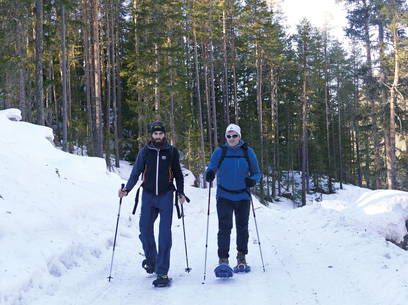 Zum Beispiel eine Schneeschuhtour auf der Tauferbergrunde. Dank der Ortskenntnis unseres Guides Vitus Auer, der mit Anfang 20 der jüngste Bergführer Österreichs war, marschieren wir mit den Fellen nicht nur auf Waldwegen, sondern auch „offroad“. Dabei genießen wir es, kein Ausrutschen auf Schnee oder Eis fürchten zu müssen und den Blick für die schönen Aussichten frei zu haben. Ziel unserer zweistündigen Tour ist das Wiesele, eine am Nachmittag in Sonne getauchte Lichtung.