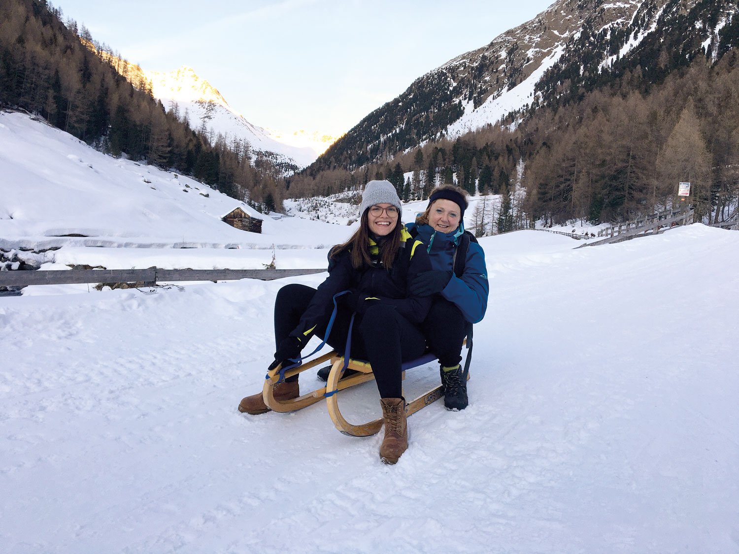 Ein Angebot, das allen Gästen offensteht, sind Winterspaziergänge rund um den Ort. In rund 50 Minuten geht es etwa zur Larstigalm. Der leicht ansteigende Weg führt immer am wild rauschenden Horlachbach entlang. Schneebedeckte Gesteinsbrocken und Bäume flankieren ihn bis zu einer kleinen Kapelle, hinter der die Alm liegt. Hier wärmen wir uns bei Suppe, Strudel und dem obligatorischen Schnapserl auf, bevor die Rückfahrt ansteht. Für die stellt der Wirt gegen eine Gebühr von drei Euro Schlitten zur Verfügung. Und so düsen wir die dreieinhalb Kilometer nach Niederthai auf Rodeln hinab. Der Fahrtwind lässt die Augen tränen, der Schnee staubt uns ins Gesicht, und wir fühlen uns wieder wie Kinder. Unten am Rodeldepot der Larstigalm trennen wir uns nur ungern von dem nostalgischen Transportmittel.