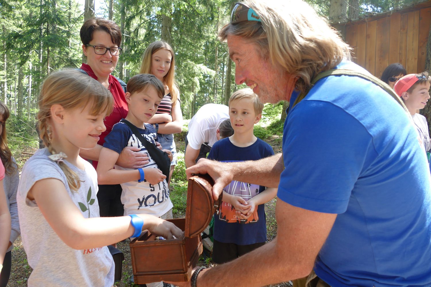 An der Talstation treffen wir Hubert Kranz vom Kids Club. Erstaunte Blicke bei den Kindern: Der Betreuer trabt ohne Schuhe über den Asphalt auf uns zu. „In den Sommermonaten bin ich immer barfuß unterwegs“, erklärt er und stellt sich als Hubsi vor. „Denn unser Programm beschäftigt sich viel mit Abenteuern in der Natur.“