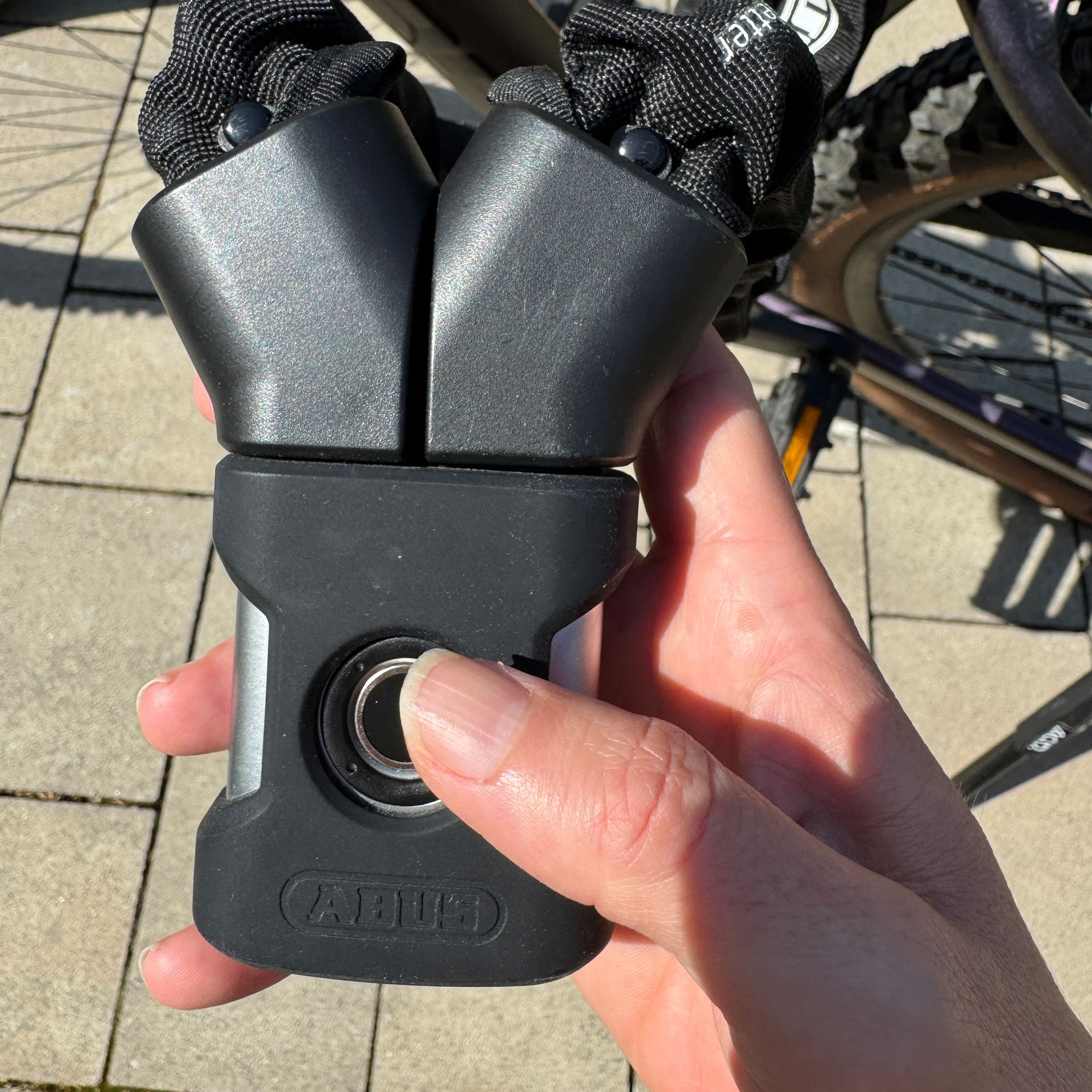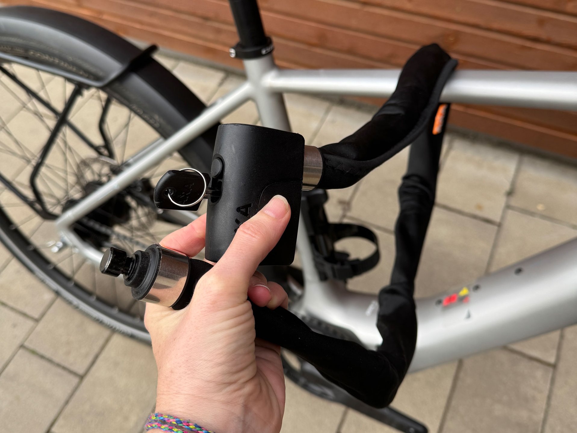 Etwas umständlich fanden wir, dass man auch zum Anschließen des Fahrrads den Schlüssel benötigt. Die steifen Gliederelemente machen das Schloss etwas weniger flexibel in der Handhabung.
