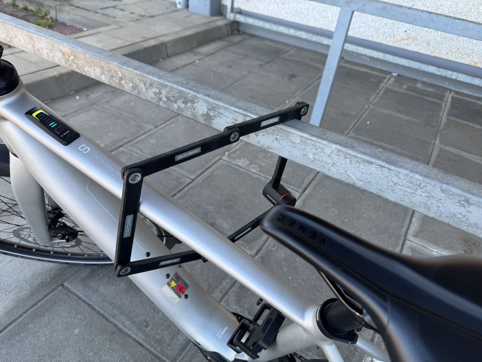 Wir haben das Schloss an einem Damenrad getestet, wo es aufgrund der Sperrigkeit beim Aufsteigen auf das Rad etwas hinderlich war. Das E-Bike ließ sich mit dem Schloss gut und sicher anschließen. Wobei der Umfang des Bügels – wie bei Bügelschlössern im Allgemeinen – begrenzt ist und das Fahrrad so an dicken Laternenmasten kaum befestigt werden kann. Bei den üblichen Fahrrad-Bügelständern war das Anschließen jedoch problemlos möglich.
