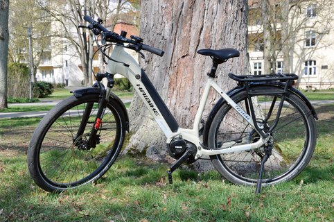 Doch das Trekking-Rad hat auch seine Nachteile: Trotz Aluminiumrahmen ist es mit seinen knapp 25 Kilogramm sehr schwer, was vermutlich am im Unterrohr verbauten 500-Wh-Akku liegen mag, der schon alleine fast vier Kilogramm auf die Waage bringt. Zum Glück muss man ihn zum Laden nicht immer ausbauen. Wer eine Steckdose am Fahrradstellplatz hat, kann das Kabel bequem direkt einstöpseln. Aufgrund der massiven Bauweise kann der Tiefeinsteiger mit 130 Kilogramm beladen werden und ist somit eben langstreckentauglich.