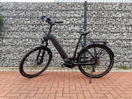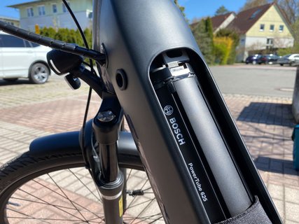 Beim Fahren besonders auffällig sind die satte Straßenlage und die extreme Steifigkeit des Rahmens trotz seines tiefen Einstiegs. Mitentscheidend dafür ist ein voluminöses Unterrohr, das einen Bosch-Akku mit 625 Wh aufnimmt. Der knapp vier Kilo wiegende Energieträger ist unter einer Abdeckung abschließbar verwahrt und lässt sich mit zwei Handgriffen herausnehmen. Ist der Akku vollständig geladen, verspricht der Eco-Modus satte 110 Kilometer Reichweite, über 70 sind es in Stufe Tour. Das Rad rollt so leicht, dass nicht ständig pedaliert werden muss. So kann am Ende einer anderthalbstündigen Fahrt mehr Reichweite auf der Anzeige stehen als beim Start. Die Treppe runter in den Keller will man das E-Triton Plus bei 28 Kilo Eigengewicht aber nicht tragen müssen.