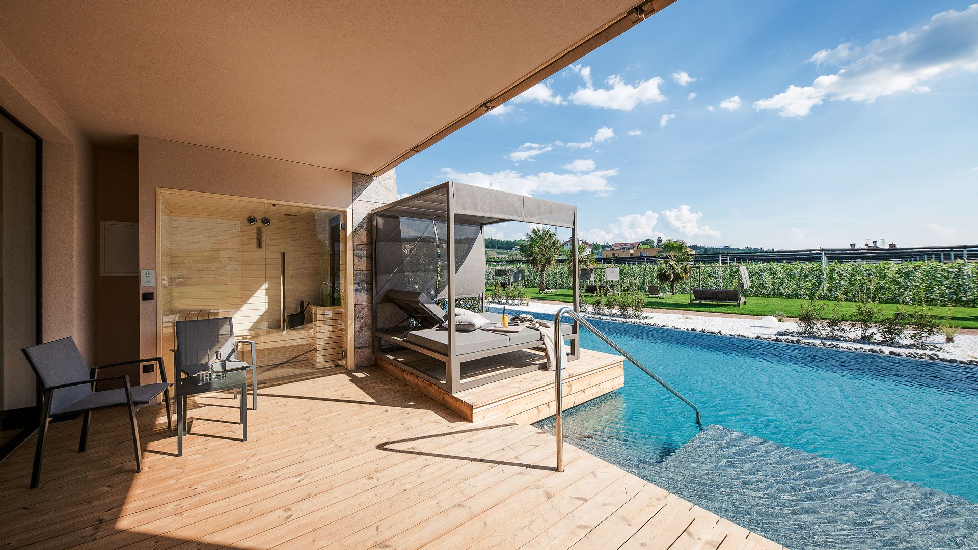Wasserfans kommen in der Royal Suite im Weinegg Wellviva Resort bei Eppan (Südtirol) auf ihre Kosten. Denn die 100 Quadratmeter große Suite bietet nicht nur höchsten Wohnkomfort, sondern auch einen direkten Zugang zum ganzjährig beheizten Suiten-Pool. Ein Steg führt von der privaten Südterrasse direkt zum Wasser. Ob zu zweit oder zu fünft: Genügend Platz bietet die Royal Suite auf jeden Fall. Im Sommer wird sich nach dem Sprung ins kühle Nass auf der Terrasse gesonnt, in den Wintermonaten geht es in die finnische Sauna. Und wer endlich einmal unter freiem Himmel schlafen will, wählt das Outdoor-Himmelbett. Ab 330 Euro pro Nacht mit Dreiviertel-Pension, Kinder ermäßigt.