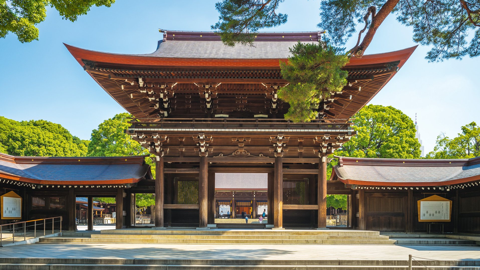 Gewidmet ist die Shintō-Stätte dem Meiji-Tenno und seiner Gemahlin, die für die Öffnung Japans stehen. Unter dem Kaiserpaar wurde in der zweiten Hälfte des 19. Jahrhunderts das Shōgunat und damit das Feudalsystem abgeschafft und der Weg zur modernen Nation geebnet: „Zuvor war Japan über Jahrhunderte von der Außenwelt abgekapselt und hatte die industrielle Revolution verpasst“, erklärt Reiseleiterin Masako Hashimoto. Gläubige schreiten zum Gebäude, halten inne, klatschen zweimal, beten und verbeugen sich.