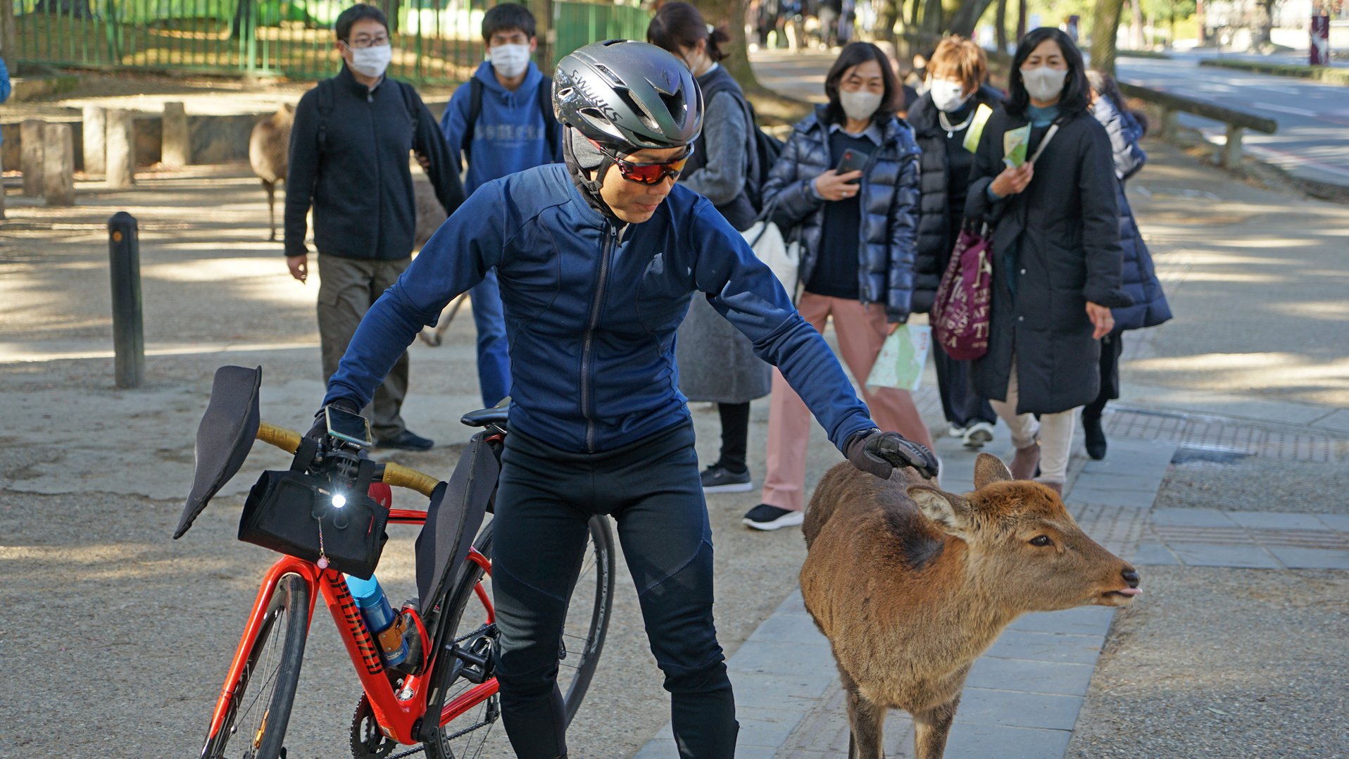Im Reigen der alten Kapitalen darf Nara nicht fehlen, das ab 710 erste ständige kaiserliche Hauptstadt war. Stars sind heute die heiligen Sika-Hirsche im Nara-Park. 1.200 dieser als Götterboten verehrten Tiere, deren Vorfahren aus dem nahen Urwald stammen, trotten zahm umher und betteln nach Futter, das in Keksform an Ständen verkauft wird und sie standortfest und zur verlässlichen Attraktion macht. Doch kommen Touristen auch wegen des shintoistischen Kasuga-Schreins mit seinen tausenden Laternen und dem Tōdai-ji, einem der größten buddhistischen Tempel und „größtem Holzbauwerk der Welt“, betont Masako. Es beherbergt eine 15 Meter hohe Statue des Erwachten.