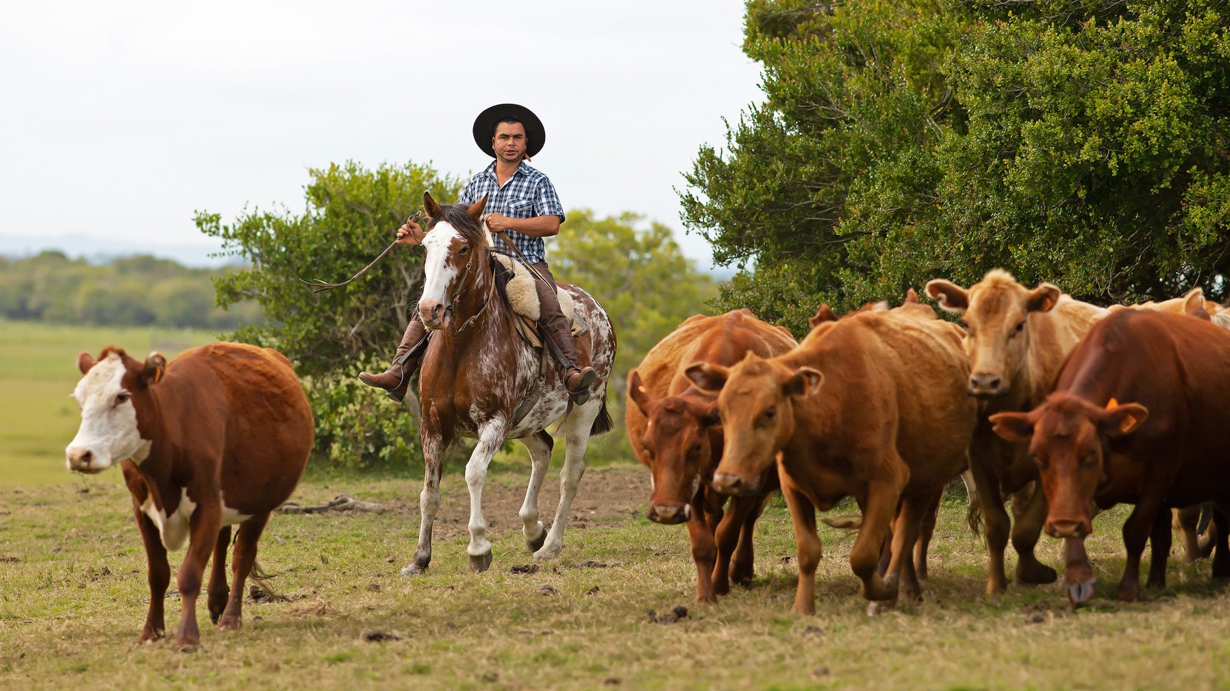 Gaucho Gonzalo Balduvino sitzt auf einer Bank im Garten der Estancia Guardia del Monte und genießt die ersten Sonnenstrahlen über der Laguna de Castillos. Neben ihm wartet die achtjährige Criollostute Overa auf ihren Einsatz. Wie jeden Morgen soll sie helfen, die grasenden Artgenossen vom Lagunenufer einzutreiben, um mit ihnen die Rinder in die Pampa zu bringen. „Der Criollo ist bei uns das Arbeitspferd auf den Farmen, weil er kräftig, ausdauernd und gehorsam zugleich ist. Wir Gauchos sind ja ursprünglich Tagelöhner in der Viehzucht und dabei auf die Hilfe eines verlässlichen Pferdes angewiesen“, sagt Gonzalo und zieht mit einem metallenen Trinkhalm einen Schluck Matetee aus einem hölzernen Becher. Dann schlüpft der 34-Jährige in die traditionelle Gauchokleidung: die Bombacha, eine Pluderhose, die Botas de Suela, feste Rindslederstiefel, und den Sombrero, einen Sonnenhut. Er schwingt sich auf Overas Rücken, ruft seine drei Hirtenhunde herbei und trabt hinaus in die Pampa.
