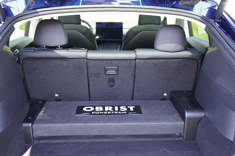 Auf den ersten Blick gleicht der Obrist-Tesla einem Model Y, bei genauerer Betrachtung fällt jedoch die veränderte Frontschürze auf. Wo Elon Musks Designer möglichst glatte Flächen und geschlossene Formen realisiert haben, gähnen beim Obrist-Umbau mehrere Kühlluftöffnungen um die Wette. Sogar in die Haube wurden zwei Öffnungen für eine bessere Ventilation gestanzt. Wo bei heckgetriebenen Tesla-Modellen der zusätzliche Stauraum vorne namens Frunk seinen Platz hat, sitzt im Obrist-Prototyp der kompakte, nur rund 110 Kilogramm schwere Verbrennungsmotor.
