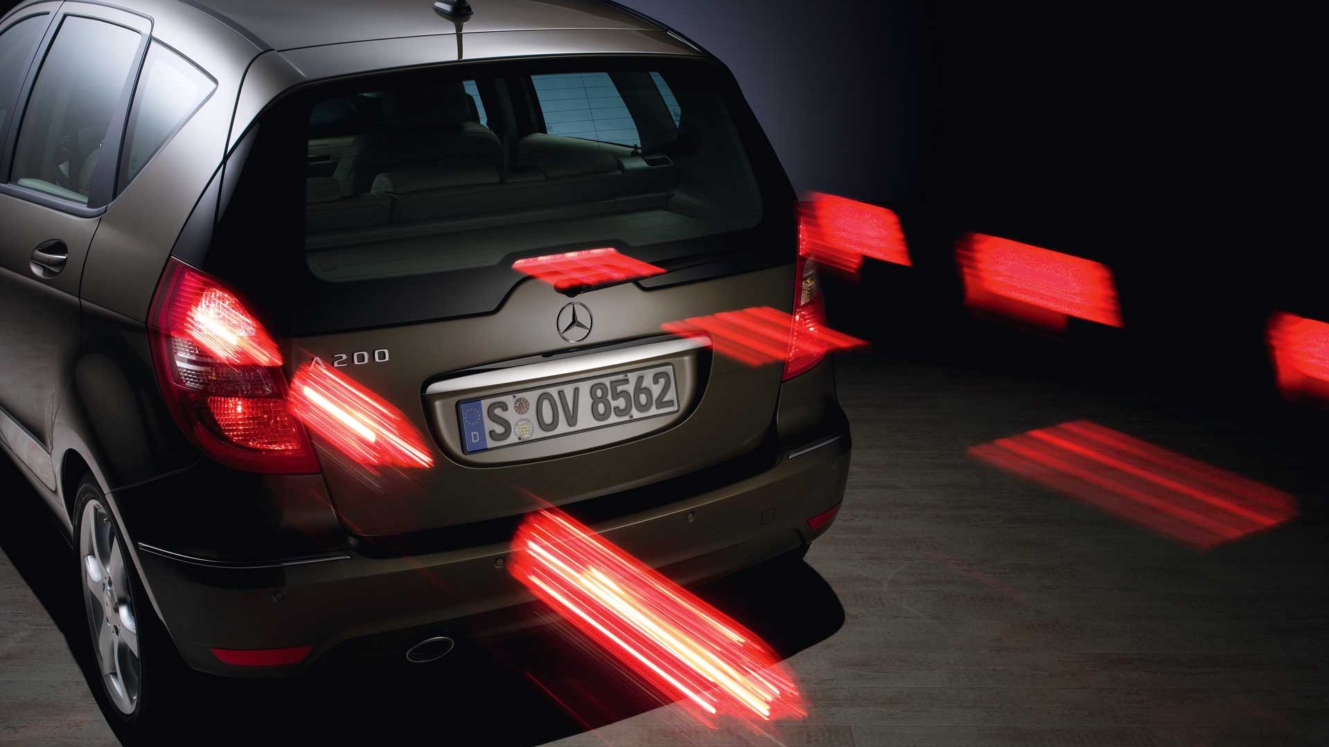 Wird das Fahrzeug bei einer Geschwindigkeit ab 50 km/h stark abgebremst, leuchten alle Rückleuchten auf. Die Bremslichter blinken in schneller Folge, um den rückwärtigen Verkehr zu warnen. Wenn das Fahrzeug zum Stillstand kommt, schaltet sich die Warnblinkanlage ein und das Bremslicht leuchtet dauerhaft.