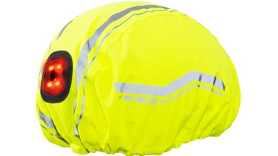 Wasserdicht, reflektierend und atmungsaktiv. Integriertes wiederaufladbares LED-Rücklicht erhöht die Sichtbarkeit zusätzlich. Gummiband mit Kordelzug für sicheren Sitz auf dem Helm.