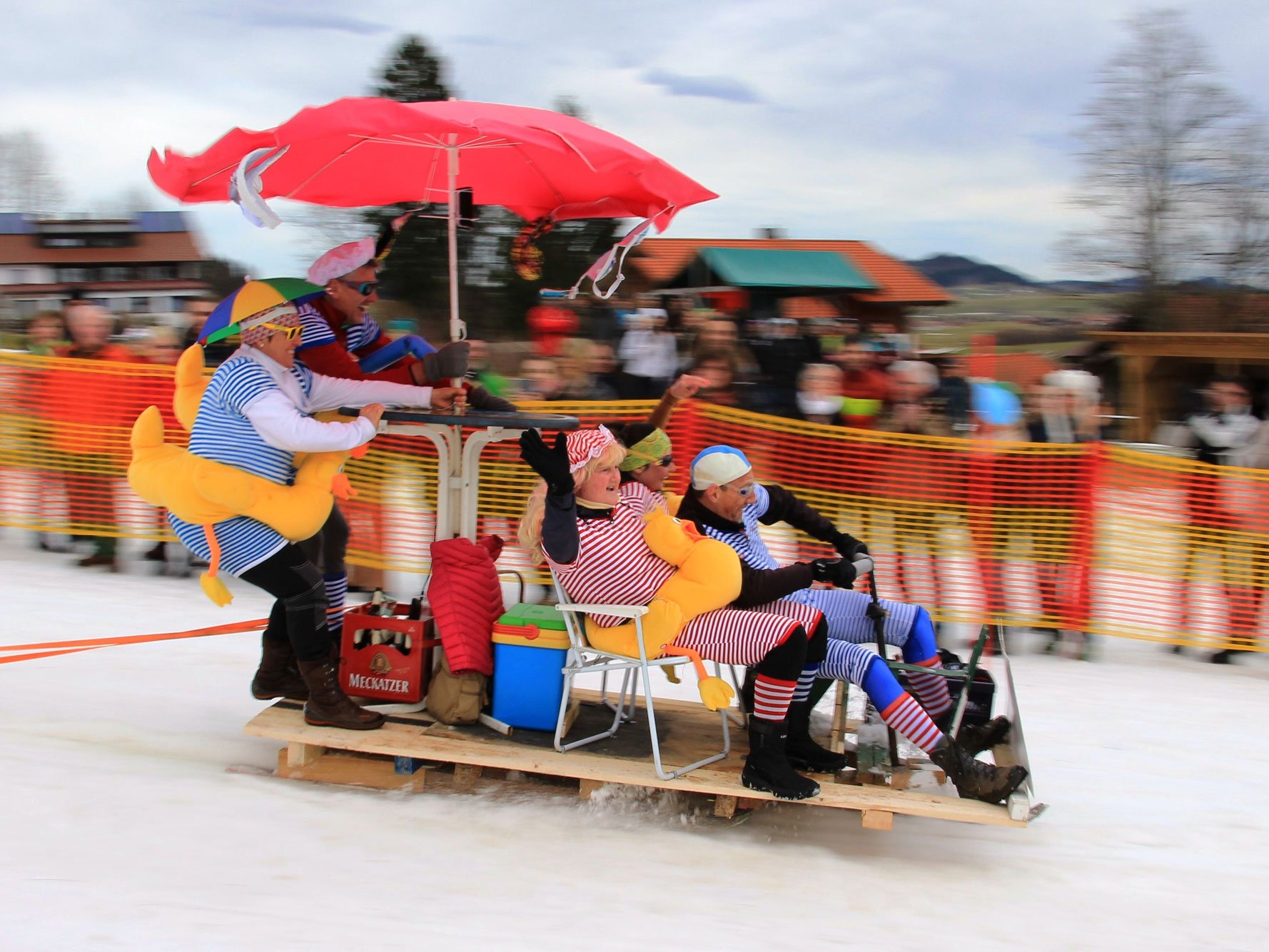 Manchmal kann Zuschauen genauso viel Spaß machen wie Selbstfahren. Beim wohl verrücktesten Narrenumzug auf Kufen in Pfronten-Röfleuten am Sonnenlift sausen am Faschingssonntag, 19. Februar 2023, kreativ gestaltete Schlitten mit verkleideten Einzelfahrern oder Teams den Berg hinunter. Neben Filmszenen und Zirkus wird auch die ein oder andere Szene aus überregionaler und lokaler Politik aufs Korn genommen. Einen Tag vorher wird es im Pfrontener Ortsteil Kappel historisch: Bis zu 200 Männer und Frauen stürzen sich dann beim Pfrontener Schalengge-Rennen mit hölzernen Hörnerschlitten – Schalenggen genannt – den 1.000 Meter langen Hang hinab. Mit diesen wurden früher Güter wie Heu und Holz von den Bergwiesen und -wäldern ins Tal befördert.