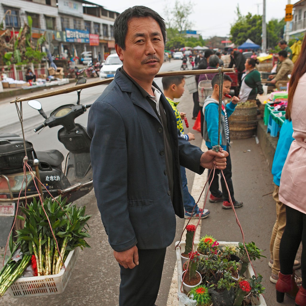 Typisch für den Fusheng sind auch die mobilen Verkäufer, die etwa blühende Kakteen mit ihren Tragestangen schultern.