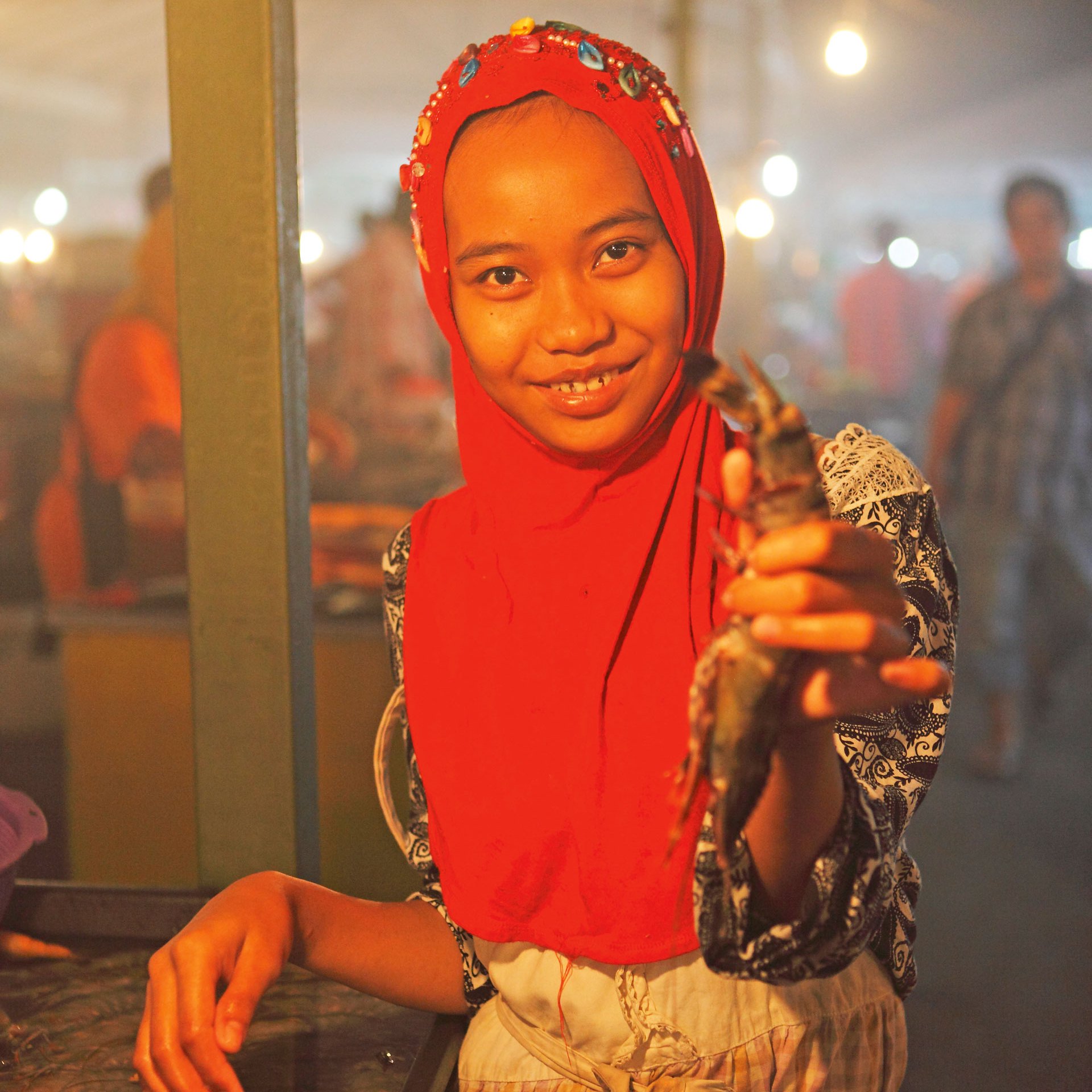 Hühnchenfleisch-Spieße, Fisch und Meeresfrüchte, wohin das Auge blickt. Es raucht, brutzelt und duftet an der Waterfront in Kota Kinabalu auf der Insel Borneo. Junge muslimische Mädchen präsentieren frische Langusten, deren Mütter wiegen derweil Tintenfisch ab. Dazwischen sitzen die Besucher auf Bänken und genießen das Halal-Food. Zum Nachtisch hängen im Nebengang Bananen von der Decke, Melonen und Ananas werden frisch aufgeschnitten. Sogar die asiatische Delikatesse Durian gibt es. Die stachelige Stinkfrucht ist allerdings nichts für empfindliche Nasen.