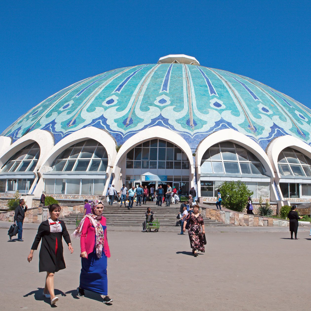 Der riesige Chorsu in Taschkent gilt als einer der ältesten Basare in ganz Zentralasien. Schon der türkisfarbene Kuppelbau, dessen Dach aussieht, als sei es mit Seilen gespannt, ist eine Pracht. Drinnen bieten gut 200 nummerierte Fleischstände Rinderfilet, Schafskopf und Pferdeherz an. Auf der Empore und an den Ständen um die Halle bekommt man Datteln, Granatäpfel, Maulbeeren und Safran. Frisches Patir-Brot, das in Usbekistan besonders zu Feiertagen begehrt ist, wird in gewaltigen Tandoori-Öfen gebacken, indem 50 Teigrohlinge pro Backgang an die Ofenwände geklatscht werden – eine uralte Tradition.