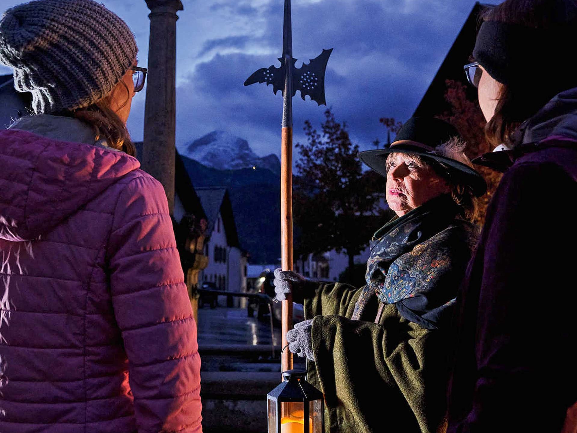 In eine Welt, als die ersten Straßenlaternen noch händisch angezündet wurden, brennende Kerzen eine Gefahr darstellten und nächtliche Unruhestifter umherstreiften, entführt Marie-Luise Bergler als historische Nachtwächterin Anna Gäste bei ihrem Nachtwächter-Rundgang durch Partenkirchen. Ausgestattet mit Laterne, dunklem Umhang und Hellebarde erzählt sie im historischen Ortskern aus dem 19. Jahrhundert.