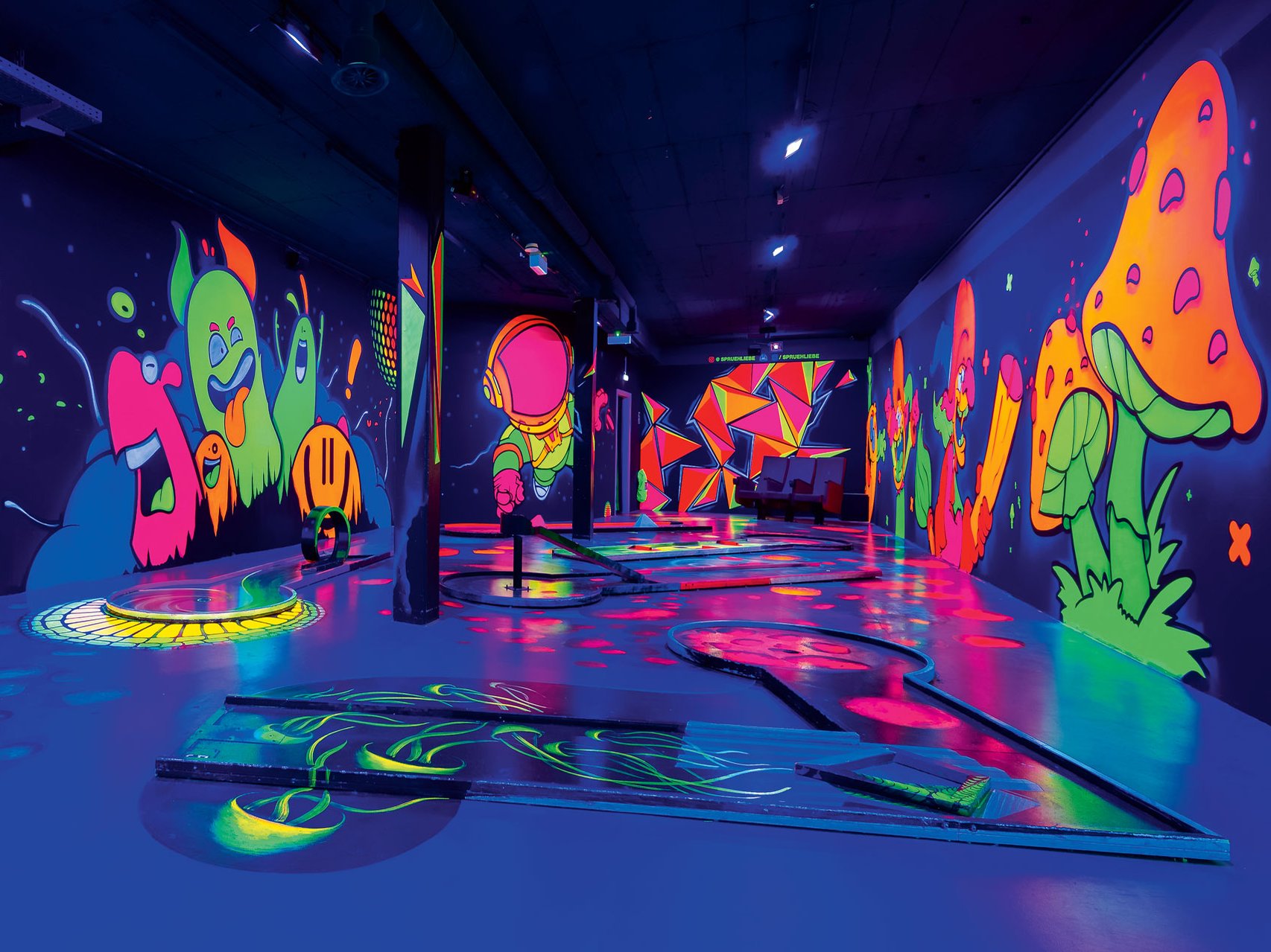 Egal ob draußen die Sonne scheint, es in Strömen regnet oder die Nacht schon hereingebrochen ist – beim Schwarzlicht-Minigolf ist es immer dunkel, zumindest fast. Denn die Finsternis wird von den im Schwarzlicht leuchtenden Minigolfbahnen und durch beeindruckende Schwarzlicht-Kunstwerke an den Wänden durchbrochen. Spektakuläre 3D-Effekte vervollständigen den Indoor-Spielspaß für alle, die gerne Minigolf spielen.
