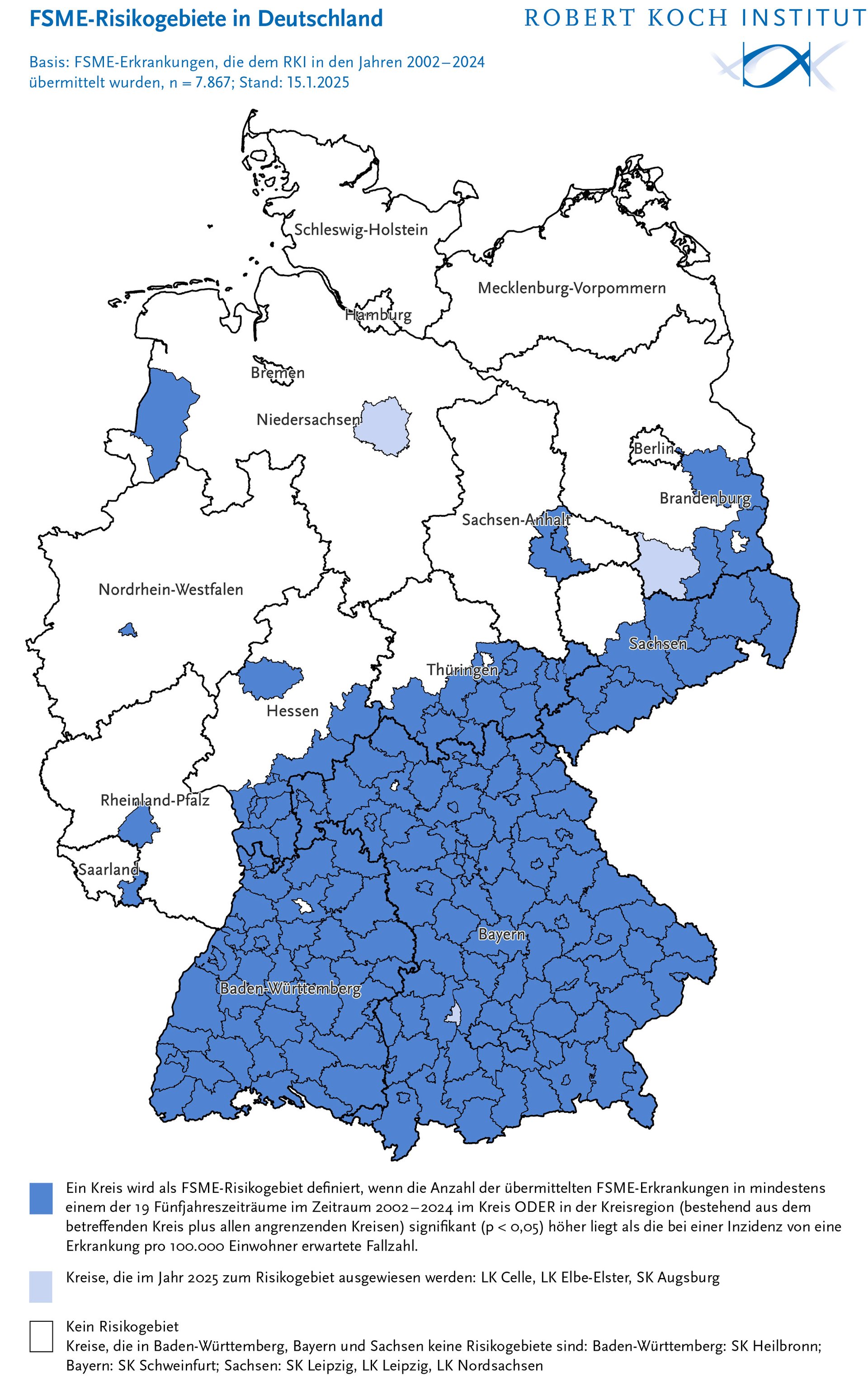 - In Deutschland hat das Robert-Koch-Institut (RKI) nun 183 Kreise als FSME-Risikogebiete ausgewiesen.