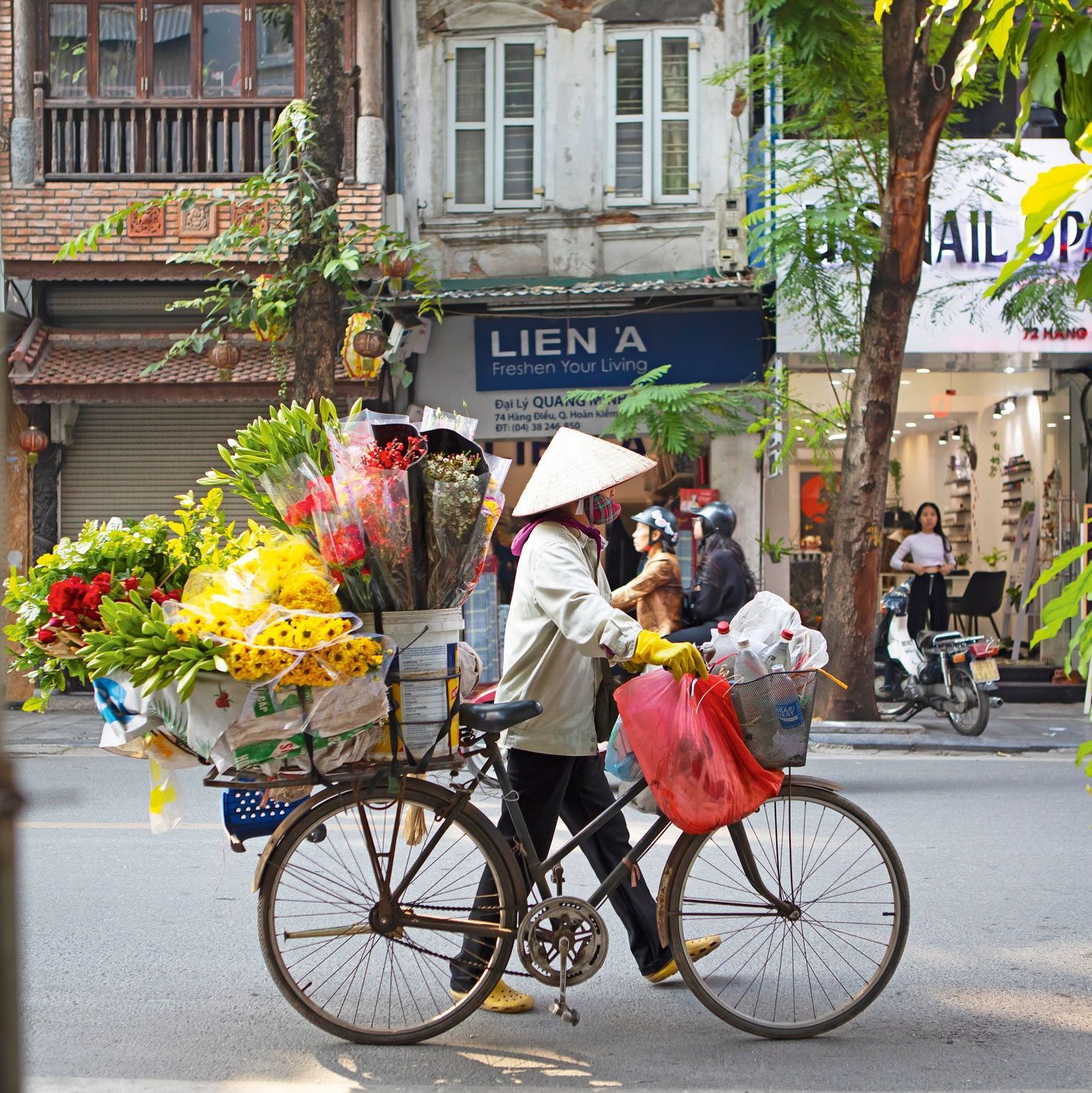 Wir setzen uns in ein Café, genießen Hanois Spezialität Egg Coffee, ein Getränk aus Eigelb, Zucker, Kondensmilch und Robusta-Kaffee, und beobachten das Treiben. Ganze Moped-Trupps ziehen hupend an uns vorbei. Touristen lassen sich von alten Männern auf Sightseeing-Dreirädern chauffieren. Marktfrauen schieben ihre mit Lilien übervoll beladenen Fahrräder umher, in der Hoffnung eine Blume oder sogar einen ganzen Strauß an den Mann zu bringen.