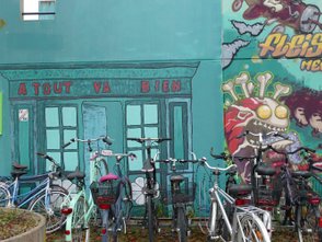 Gestartet sind wir aber nach Plan bei der BMW-Welt, um von dort in den Olympiapark weiterzuwandern. Gästeführerin Christiane Haack kennt Münchens nördliche grüne Lunge bestens und führt uns zunächst ins Olympische Dorf, wo bei den Sommerspielen 1972 Athleten aus der ganzen Welt untergebracht waren. Heute sind die kleinen Bungalows mit Balkon dort begehrte Studentenwohnungen, die von den Bewohnern oft kreativ bemalt werden.