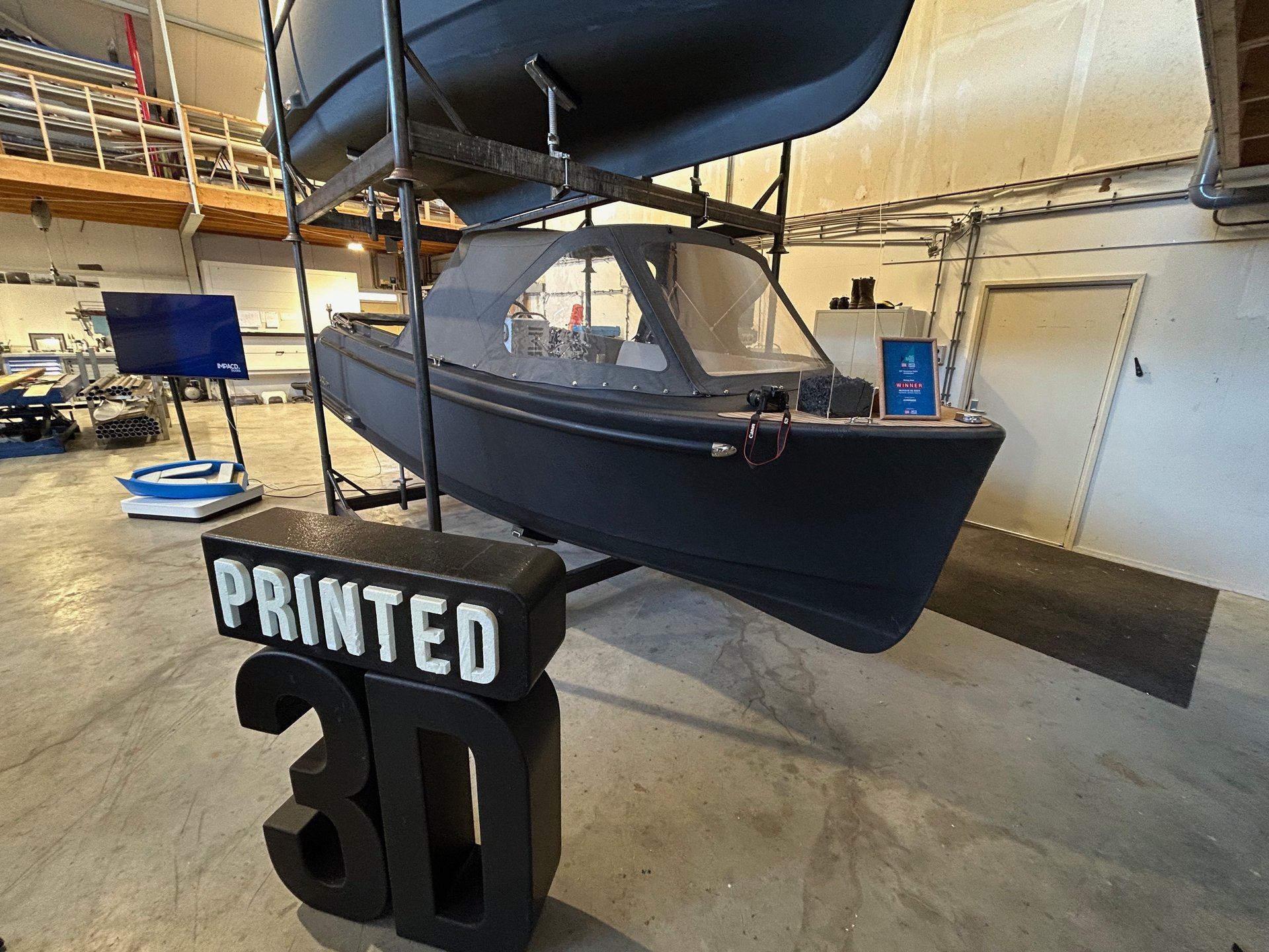 Wasser und Nachhaltigkeit spielte auch für Marieke de Boer eine Schlüsselrolle, als sie zusammen mit ihrem Mann 2020 ihr Bootsbauunternehmen Impacd-Boats gründete. Der Familienbetrieb in Woudsend fertigt die Rümpfe seiner sechs Meter langen Elektroboote im 3D-Druckverfahren in einem Stück. Etwa 60 Stunden benötigt der Drucker für einen Rumpf, dessen Wände rund einen Zentimeter stark sind. Gefüttert wird die Maschine mit Kunststoffabfällen – ein Novum in Europa. Genau genommen handelt es sich um geschreddertes Polypropylen und Polyethylen aus Haushaltsabfällen.