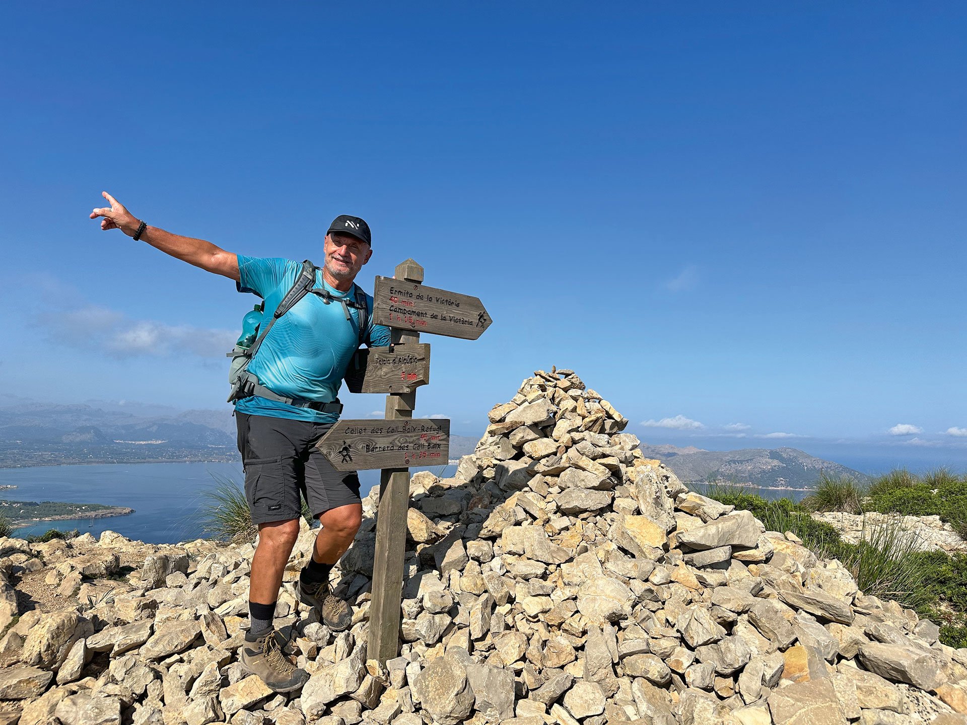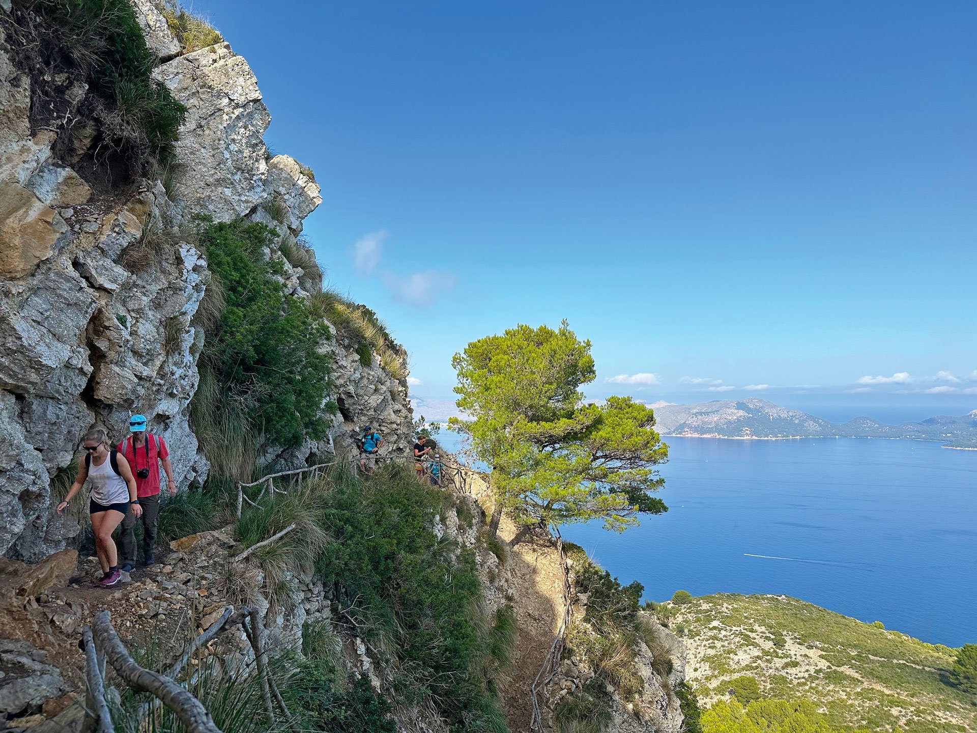 Die beiden Buchten Badia de Pollença und Badia d’Alcúdia werden durch einen etwa sechs Kilometer langen Gebirgszug voneinander getrennt, der im Cap del Pinar endet. Der höchste Punkt dieses Gebirgszuges ist der Talaia d’Alcúdia auf 446 Metern. Er lässt sich vom Parkplatz des Ermita de la Victoria, eines ehemaligen Klosters, in einer knappen Stunde erklimmen. Wanderer folgen zunächst einem schattigen Waldweg, dann einem schmalen Pfad, der an besonders exponierten Stellen mit Holzgeländern gesichert ist. Auf dem letzten Abschnitt Richtung Gipfel sind dann „Freestyle“-Kompetenzen gefragt: Es gibt keine feste Route mehr, jeder sucht sich auf dem steinigen und teils glitschigen Terrain seinen Weg. Doch der anstrengende Endspurt lohnt sich: Vom Talaia d’Alcúdia bietet sich ein fantastischer Blick auf die Buchten von Pollença und Alcúdia, die Halbinsel Formentor und Nachbarinsel Menorca. Das Gipfelpodest ist übrigens ein beliebter Treffpunkt wilder Bergziegen, die auf Leckereien aus den Proviantbeuteln der Wanderer hoffen. Tipp: Die Brotzeit lieber nach der Rückkehr auf demselben Weg an der Ermita de la Victoria genießen. Hier werden an einem Kiosk kühle Getränke und Snacks verkauft. Die kurze Tour zum Talaia d’Alcúdia findet sich im Programm von Galleria 19 Mallorca Norte. Der Veranstalter mit Sitz in Playa de Muro organisiert jeden Mittwoch eine Tageswanderung ins Tramuntana- oder Llevant-Gebirge mit Bustransfer. Auch mehrtägige Touren sind im Angebot. Guide Marcel Iseli freut sich über den wachsenden Zuspruch der Gäste auf Mallorca, gerade seit der Pandemie: „Mit Corona hat Wandern richtig angezogen“, stellt er fest. Zu den Favoriten des erfahrenen Bergführers gehören der Pilgerweg zum Kloster Lluc, die Tour von Sóller zum Cuber-Stausee und der Fernwanderweg GR 221 durch das Tramuntana-Gebirge.