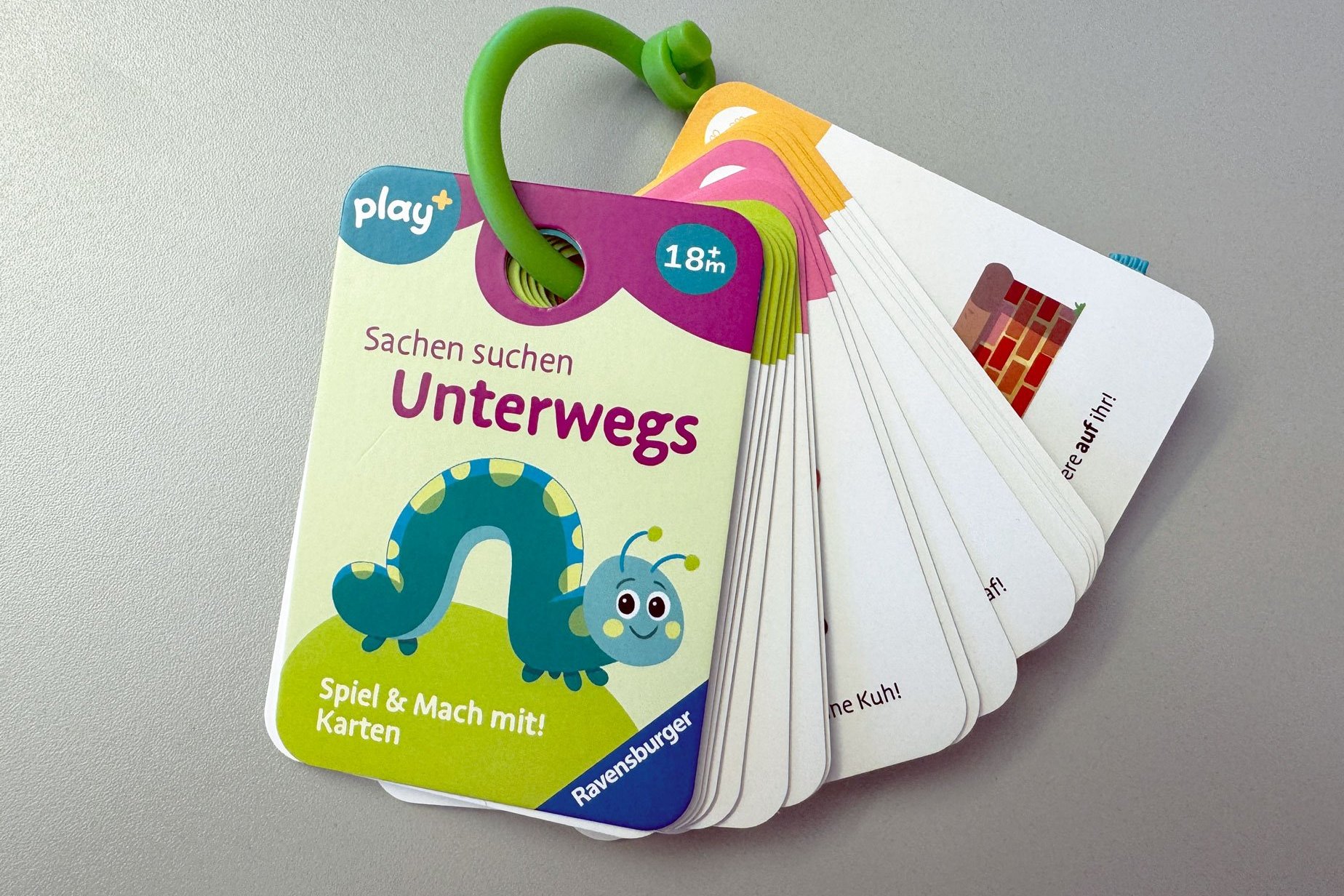 40 Karten, die mit einem Ring zusammengehalten werden, motivieren zum Suchen: ein blaues Auto, eine Ampel oder eine Kuh… Kombiniert wird die Suchaufgabe mit einer Mitmach-Aktion: Tiere nachmachen, Dinge zählen oder motorische Übungen – perfekt für eine bewegte Pause.