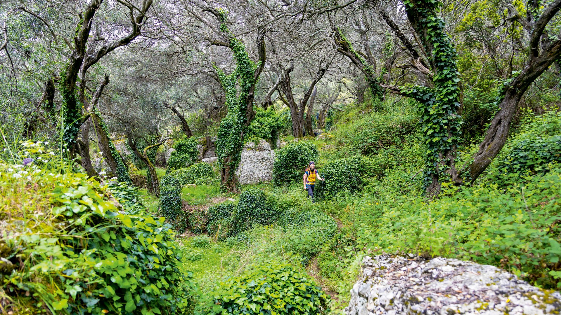 Eine abwechslungsreiche Etappe des Corfu Trails führt uns über 16 Kilometer und knapp 800 Höhenmeter von Strongili nach Sinarades. Erst umfängt uns ein dunkler Forst aus Steineichen und Lorbeerbüschen, dann folgt ein mystischer Geisterwald. Wie lange Krakenarme winden sich die Äste uralter Oliven nach oben, ihre Wurzeln ranken sich über eiszeitliche Kalksteinformationen. Mit wachem Blick lassen sich um diese Jahreszeit immer wieder die Königinnen der Blumen entdecken: wilde Orchideen. Zum Beispiel der Zungenstendel und die Hufeisen-Ragwurz sind im Norden der Insel verbreitet. Über den Gipfel des Agio Deka erreichen wir ein kleines Kloster – und haben Glück: Heute ist es geöffnet, die Gemeinde feiert das Patrozinium. Wir werden herzlich begrüßt und zu Souvlaki und Wein eingeladen.
