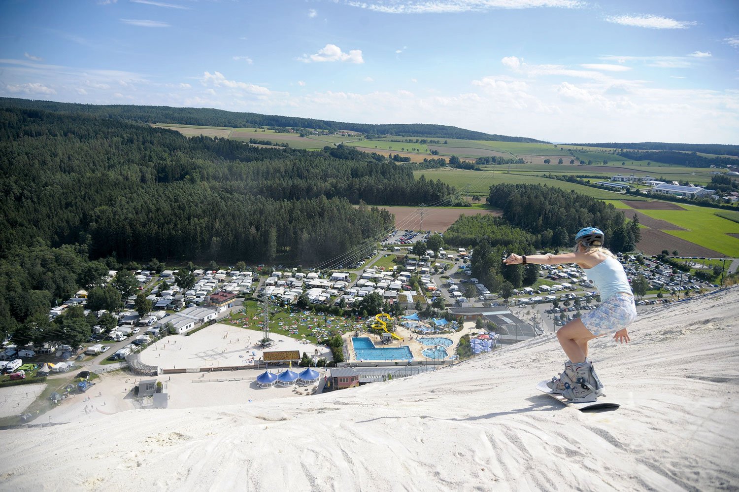Mit weißem Sand und türkisblauem Wasser überrascht der Monte Kaolino bei Hirschau. Der Quarzberg ist ein Treffpunkt für Sportler, Familien, Adrenalinjunkies und Wasserratten. Ein Lift bringt Skifahrer, Sandboarder und Zipflbob-Fahrer mühelos auf den „Gipfel“ in 150 Meter Höhe. Unerschrockene nehmen den Monte Coaster. Nach der zweiminütigen Bergfahrt geht es auf 800 Metern rasant bergab – mit einem 350-Grad-Panoramakreisel, mehreren Jumps und Wellen sowie sechs 180-Grad-Kurven. Für Erfrischung sorgt das Dünenbad mit Pools, Rutschen und einem Erlebnisbecken.